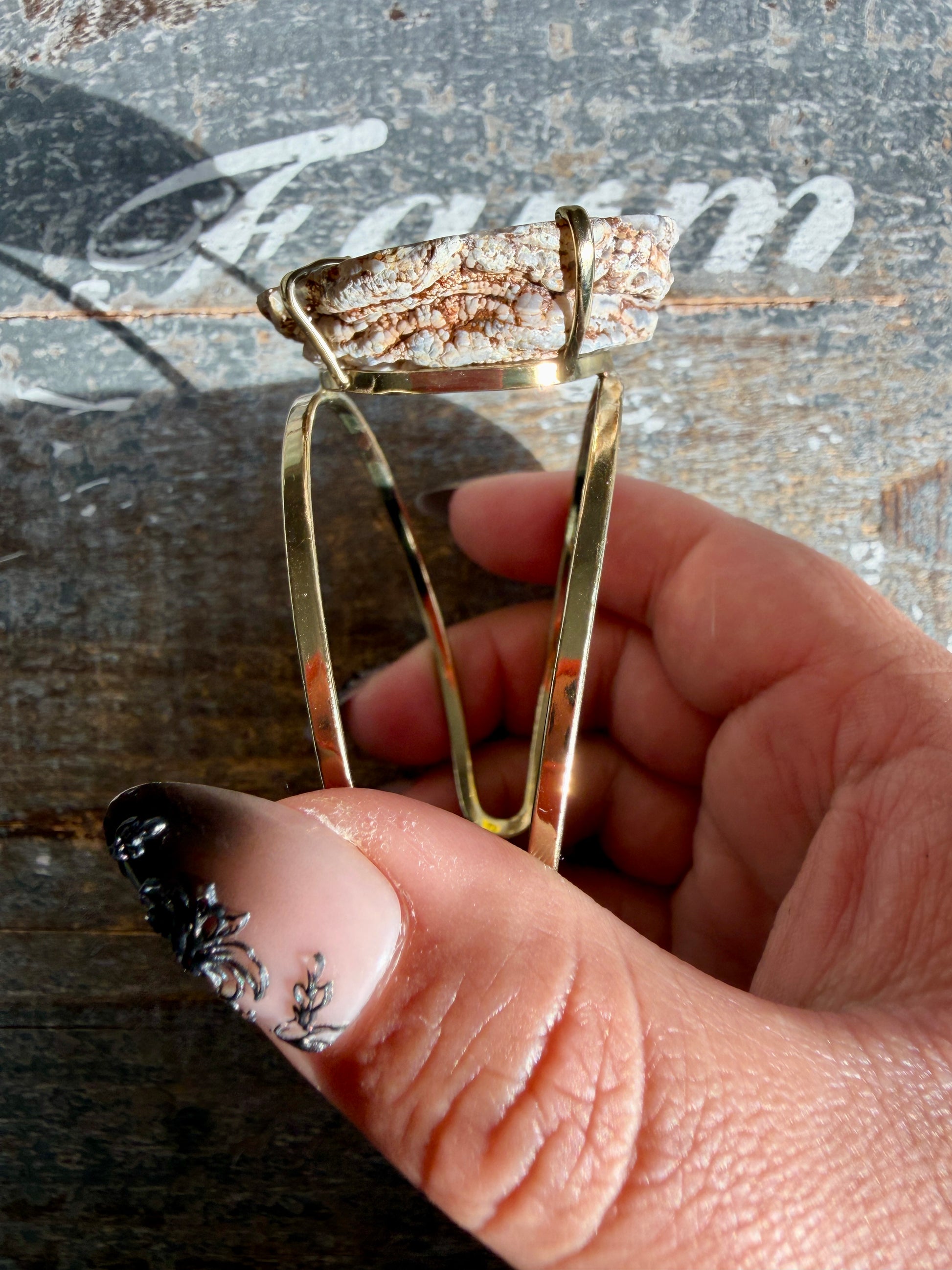 This cuff features natural Druzy Banded Agate, showcasing soft, layered agate banding surrounding a sparkling druzy crystal center. The contrast between the smooth, flowing bands and the raw crystalline texture creates a beautifully balanced, organic look.