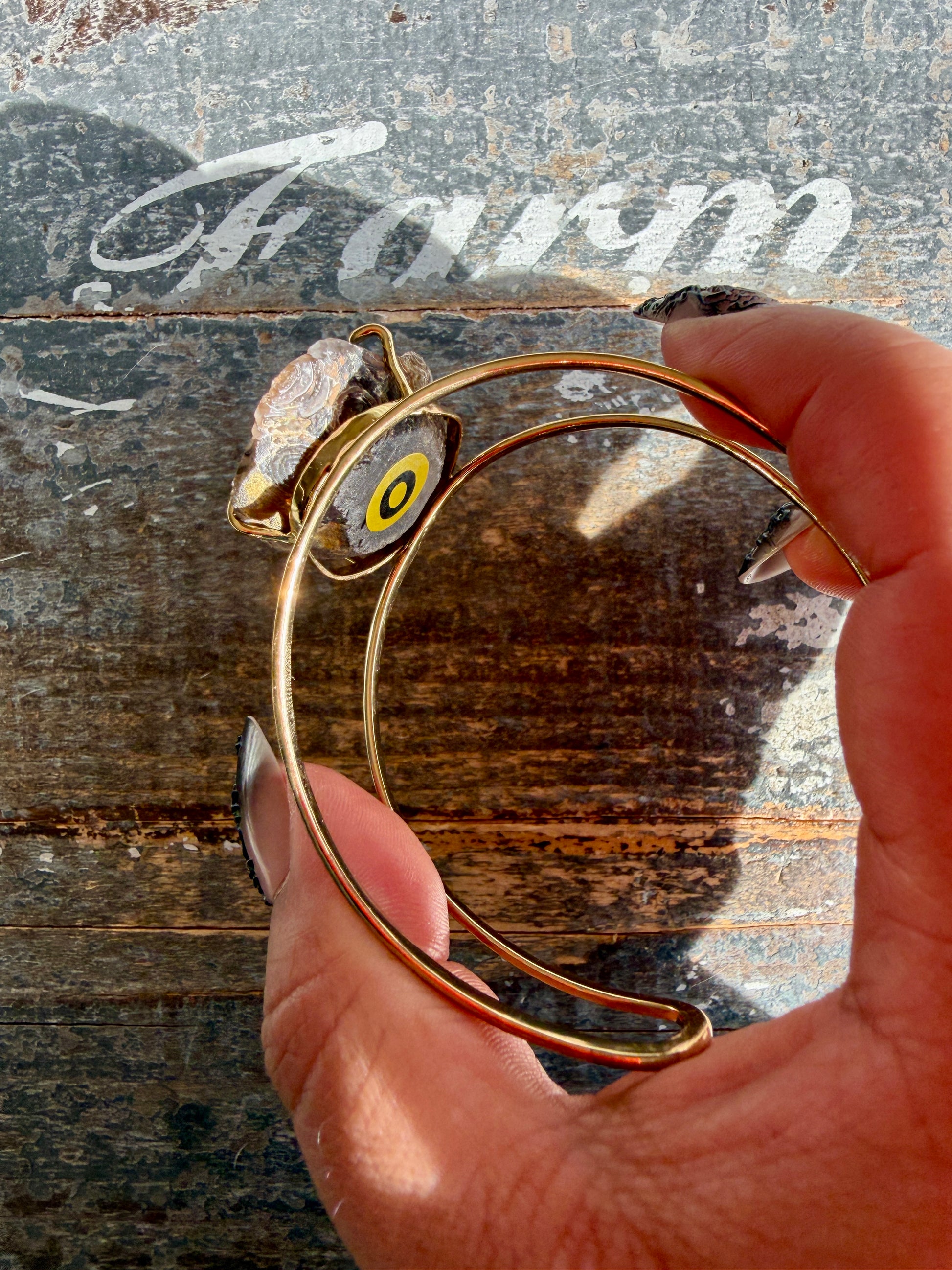 This cuff features natural Druzy Banded Agate, showcasing soft, layered agate banding surrounding a sparkling druzy crystal center. The contrast between the smooth, flowing bands and the raw crystalline texture creates a beautifully balanced, organic look.