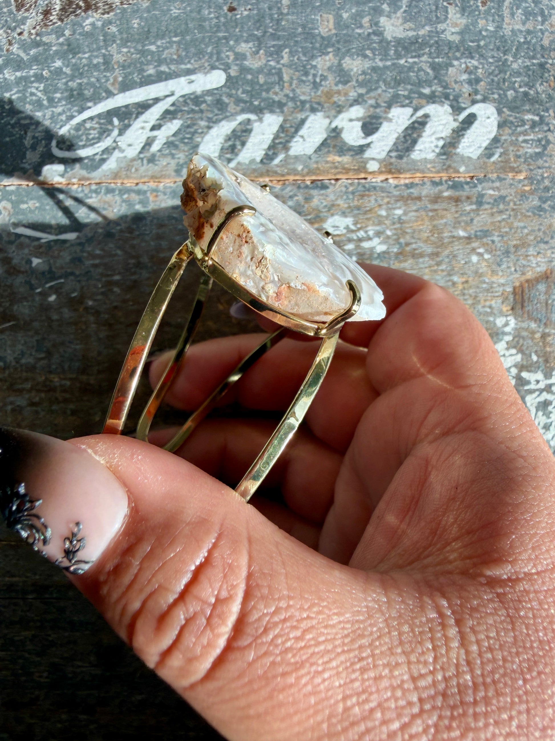 Set in a gold-tone adjustable cuff, the stone is secured while remaining the clear focal point. The open cuff design allows for a comfortable, flexible fit and highlights the natural contours of the agate from every angle.
