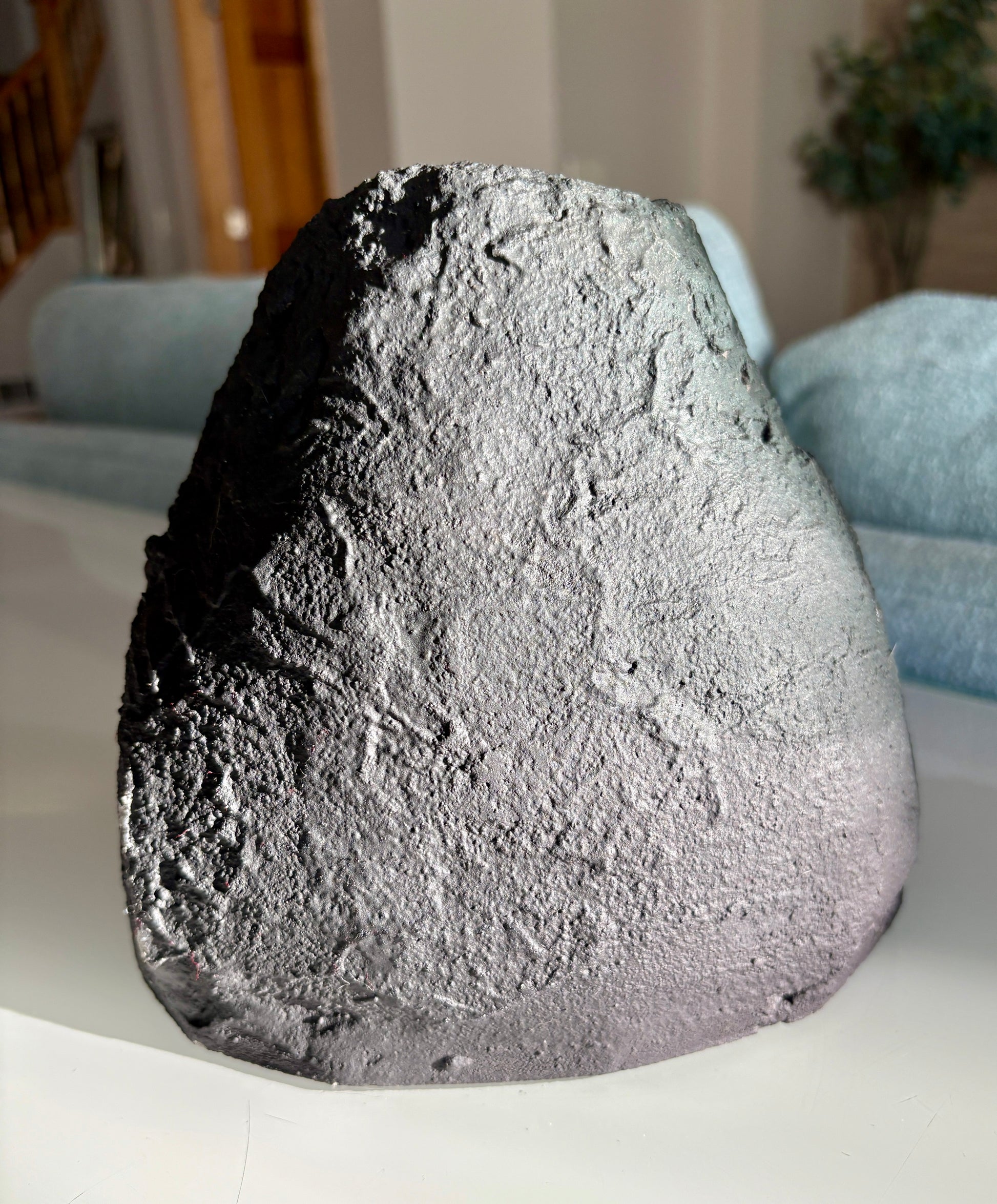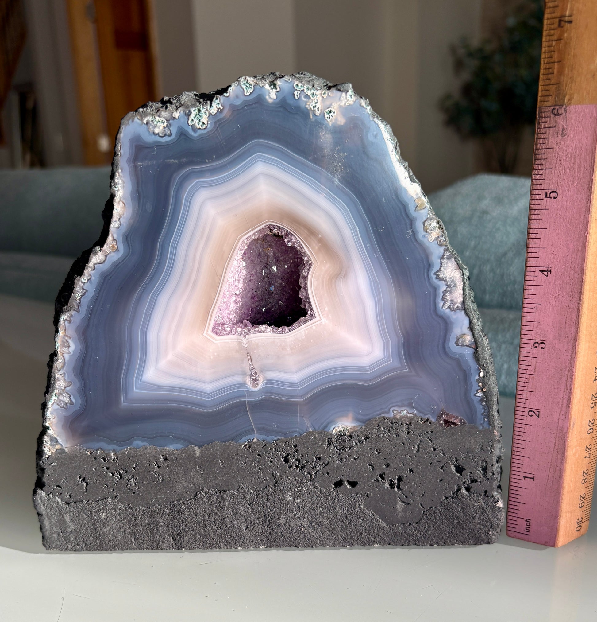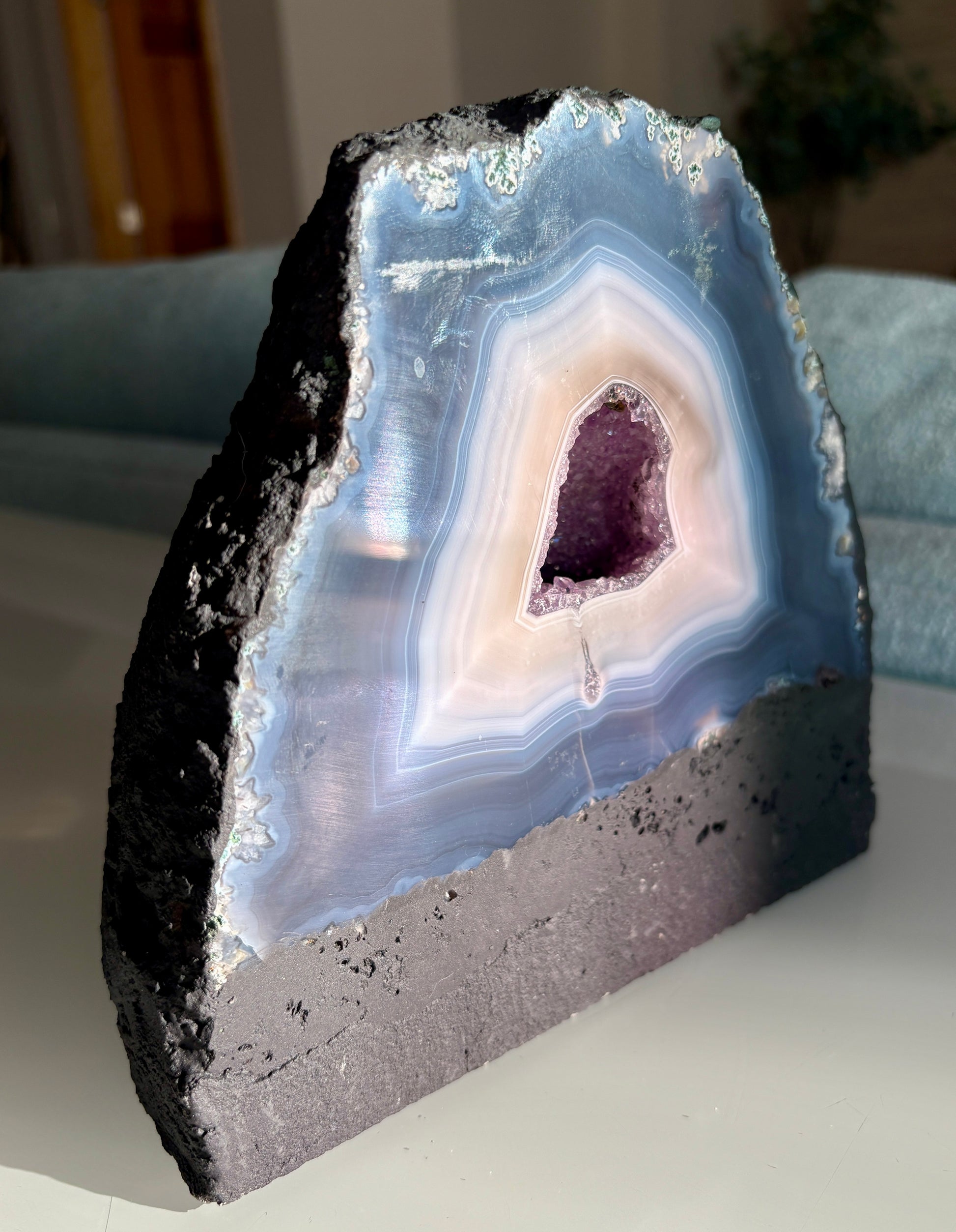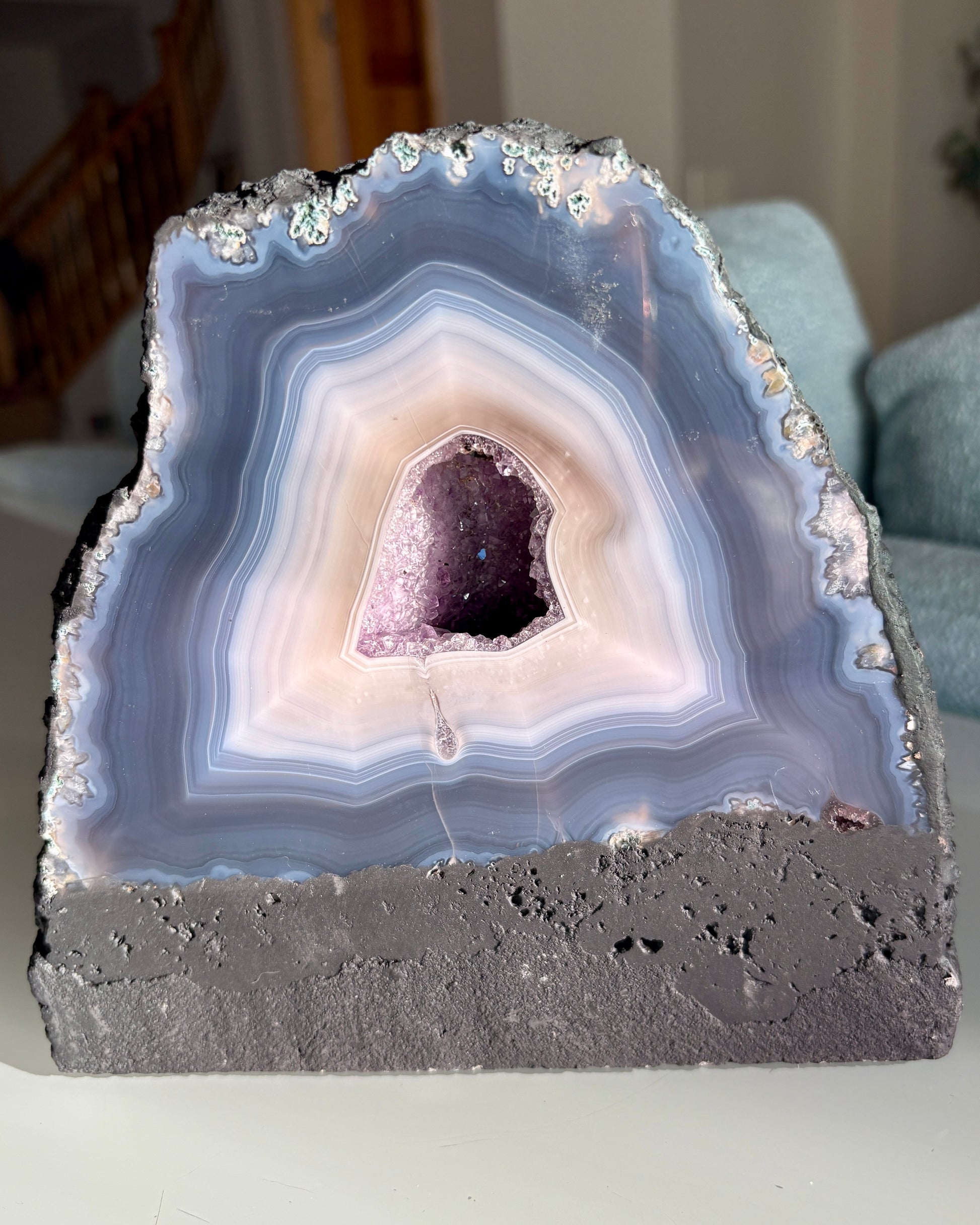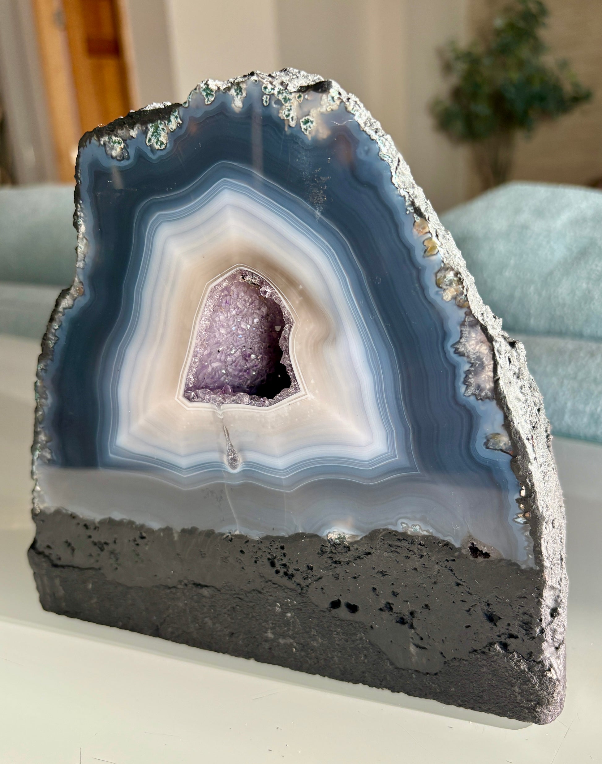 Most Amethyst Cathedrals have a cement-like or concrete-looking backing. This is not part of the natural crystal — it’s a specially applied support material used to stabilize the geode and protect it from cracking during transport and display. The amethyst crystals form inside a hollow volcanic cavity (often with an agate or quartz shell), and once extracted, the rough outer rock is reinforced with this backing to ensure the piece remains sturdy for many years to come.