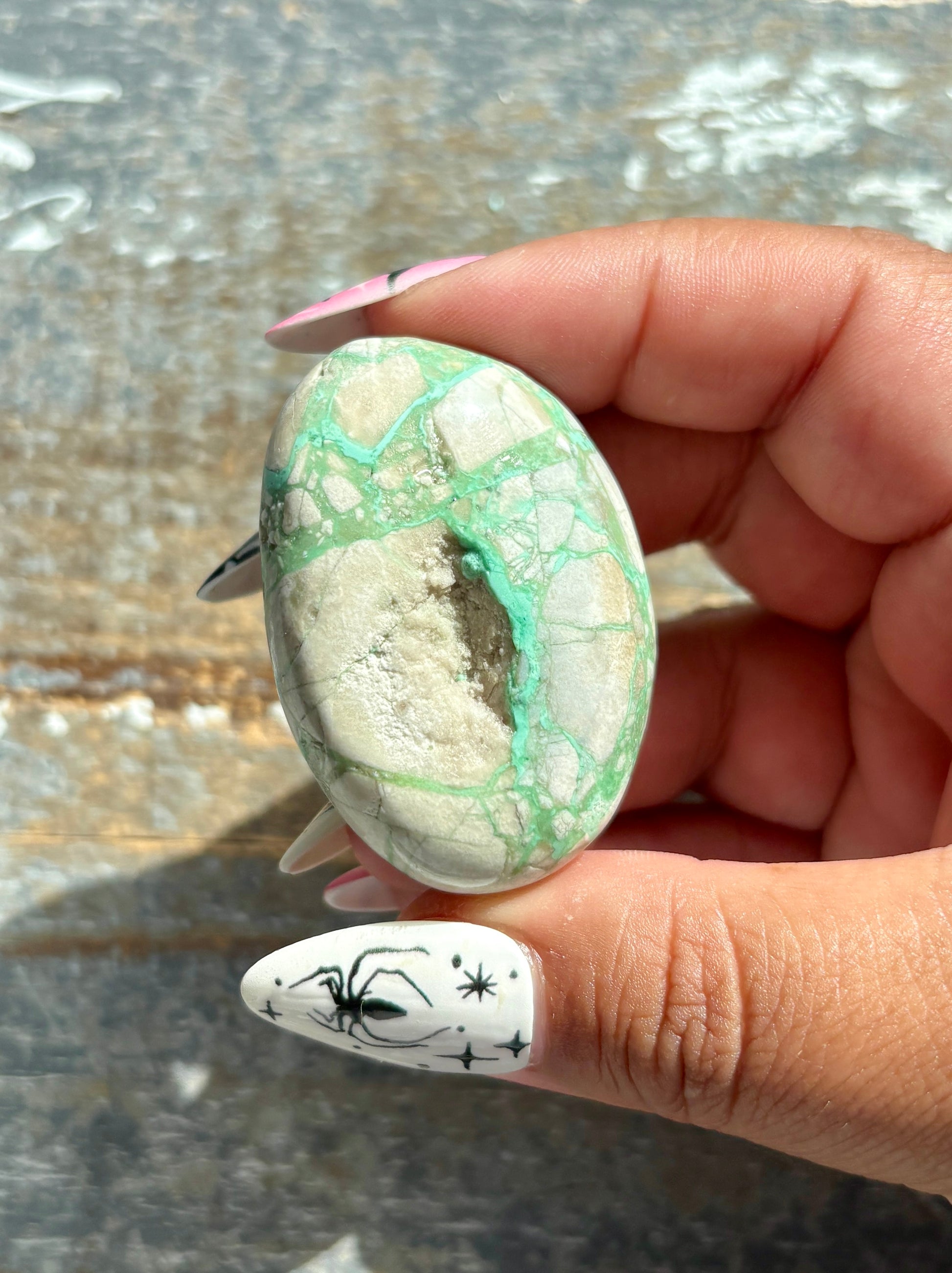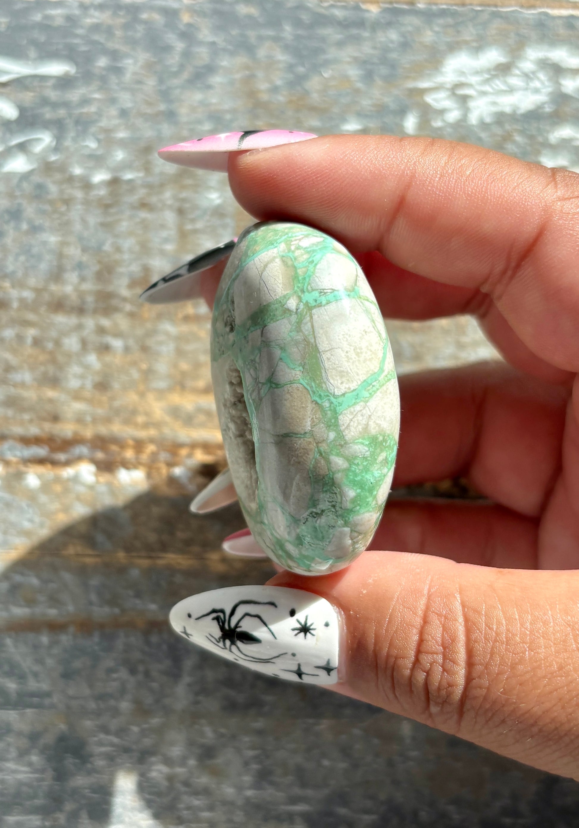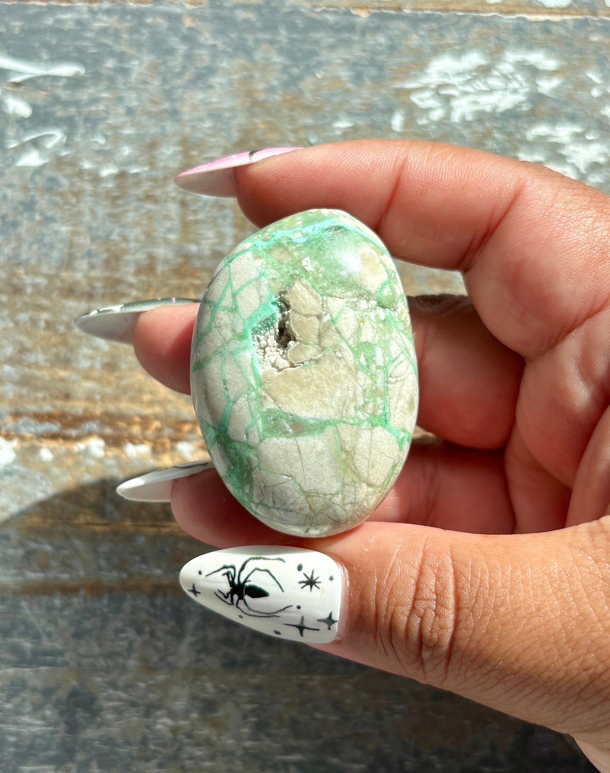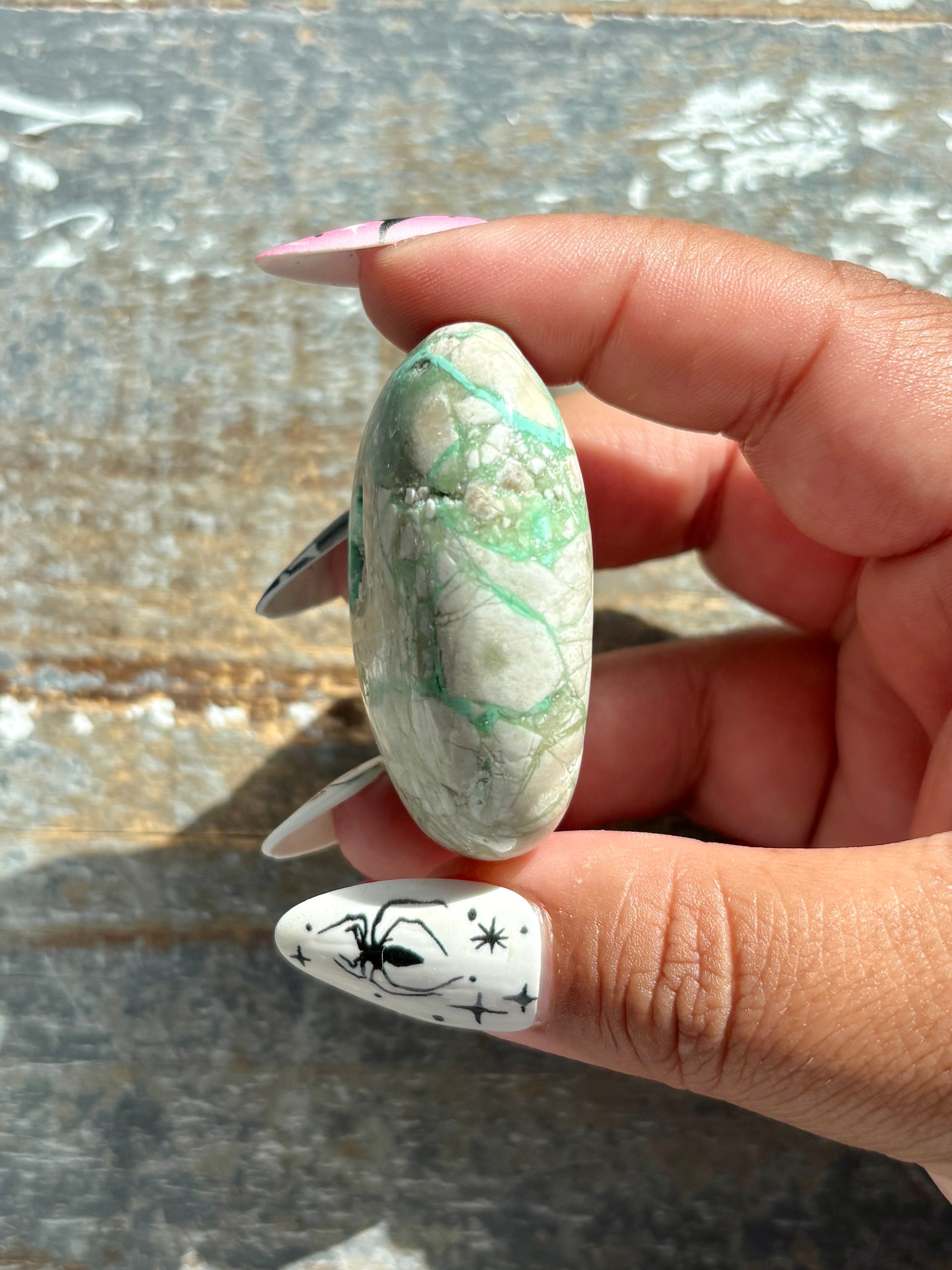 This Gorgeous Green Variscite Palm Stone from Utah is a treasure of nature, with stunning green hues and a smooth, polished surface. Hand-selected at the Denver Gem Show this palm stone is perfect for meditation, relaxation, and spiritual balance. Featuring unique patterns and a powerful energy, it's a must-have for any crystal enthusiast.