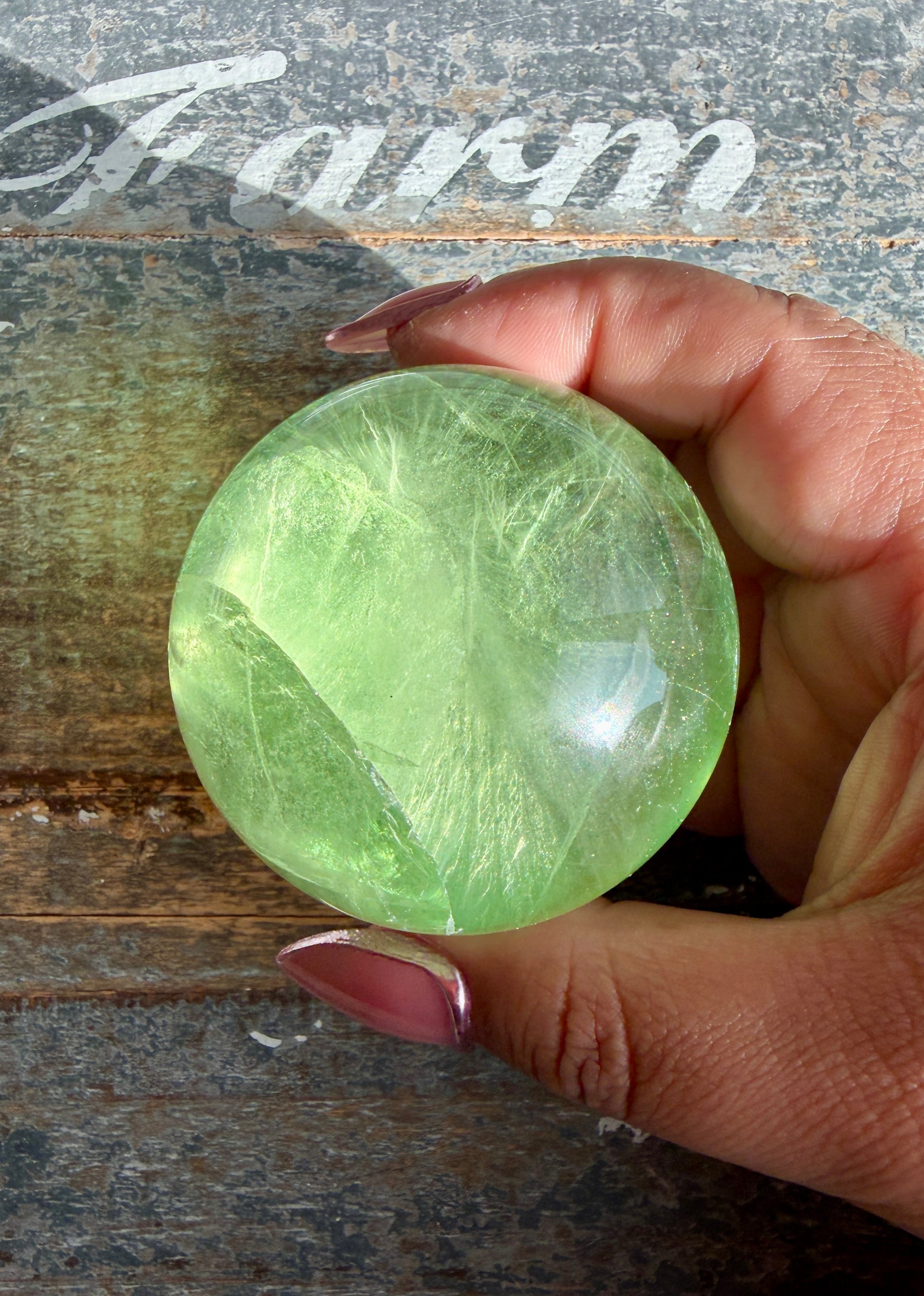Every sphere features unique internal patterns, soft banding, and that signature vibrant lime hue that makes this variation so sought after. You will receive the exact sphere shown in the photos.