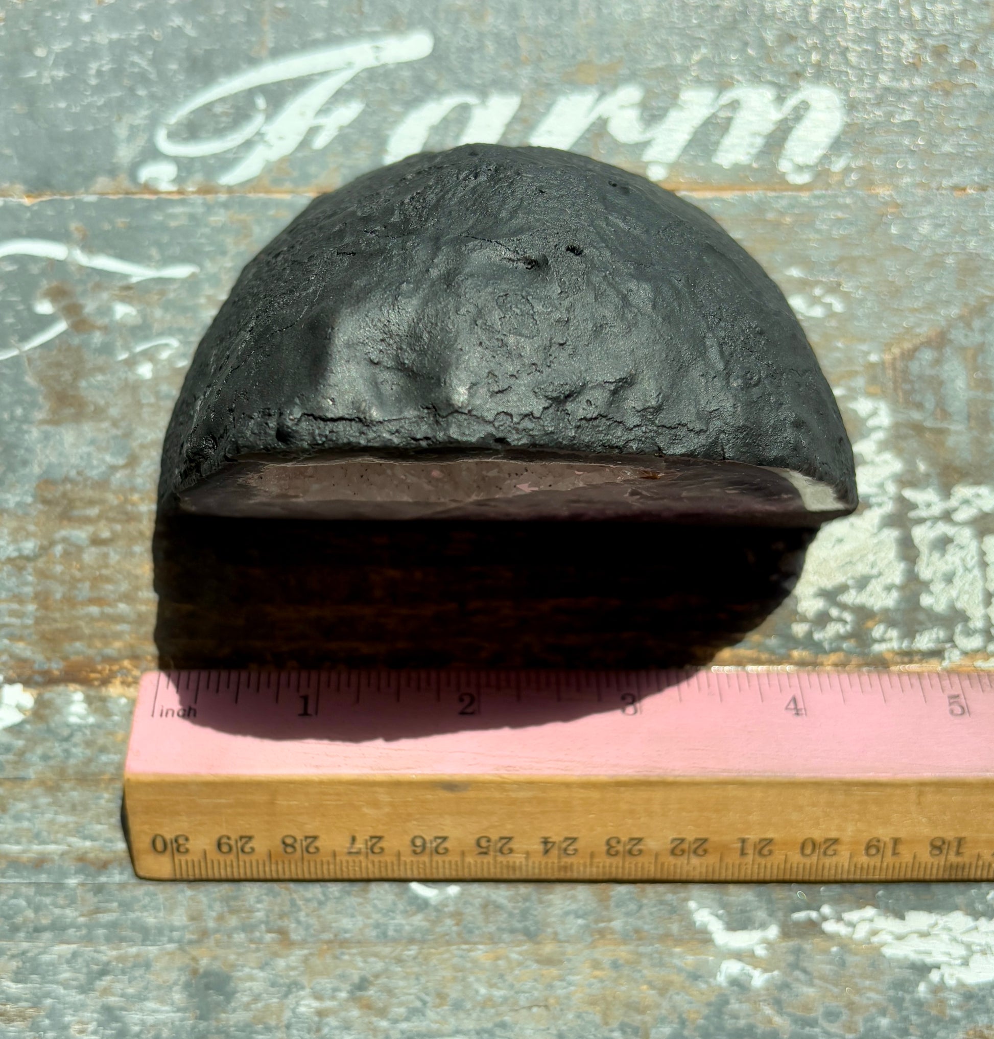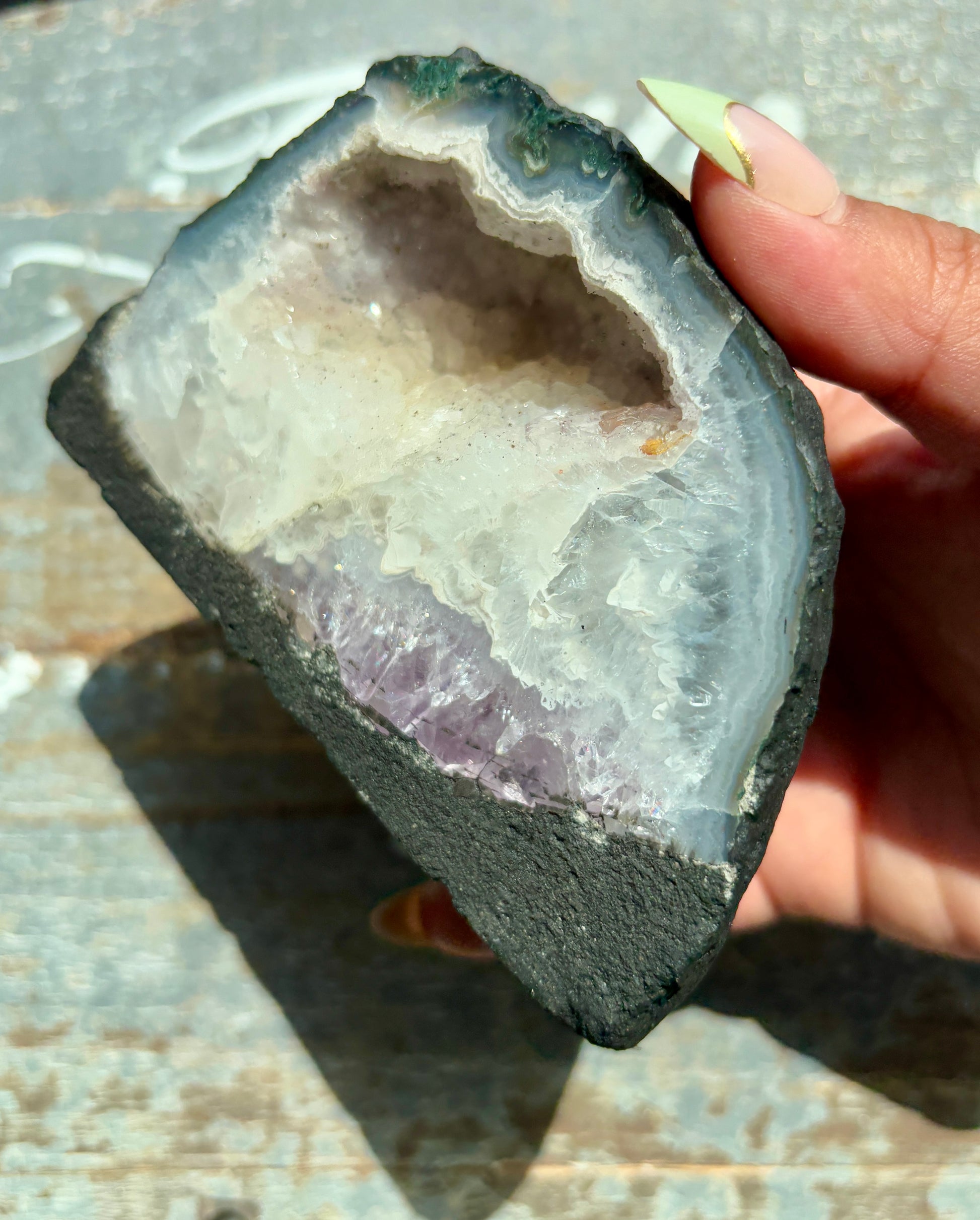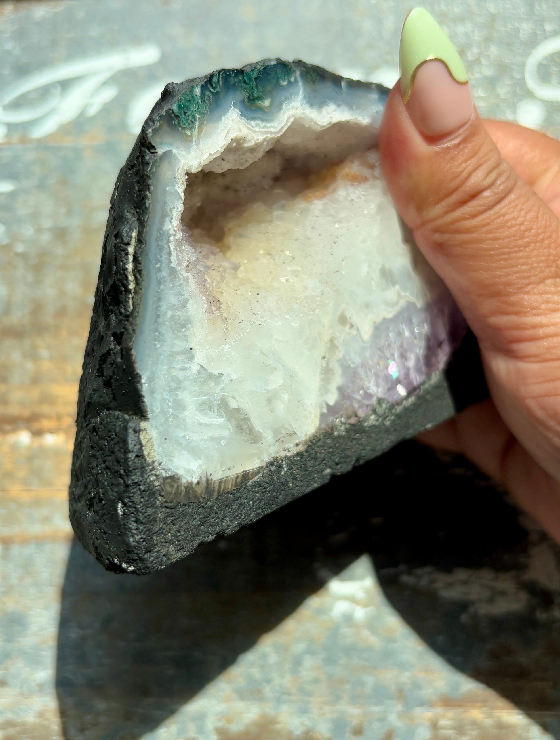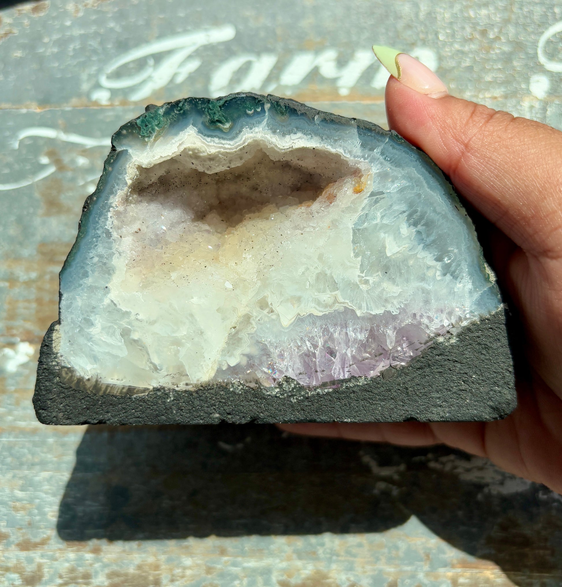 Most Amethyst Cathedrals have a cement-like or concrete-looking backing. This is not part of the natural crystal — it’s a specially applied support material used to stabilize the geode and protect it from cracking during transport and display. The amethyst crystals form inside a hollow volcanic cavity (often with an agate or quartz shell), and once extracted, the rough outer rock is reinforced with this backing to ensure the piece remains sturdy for many years to come.