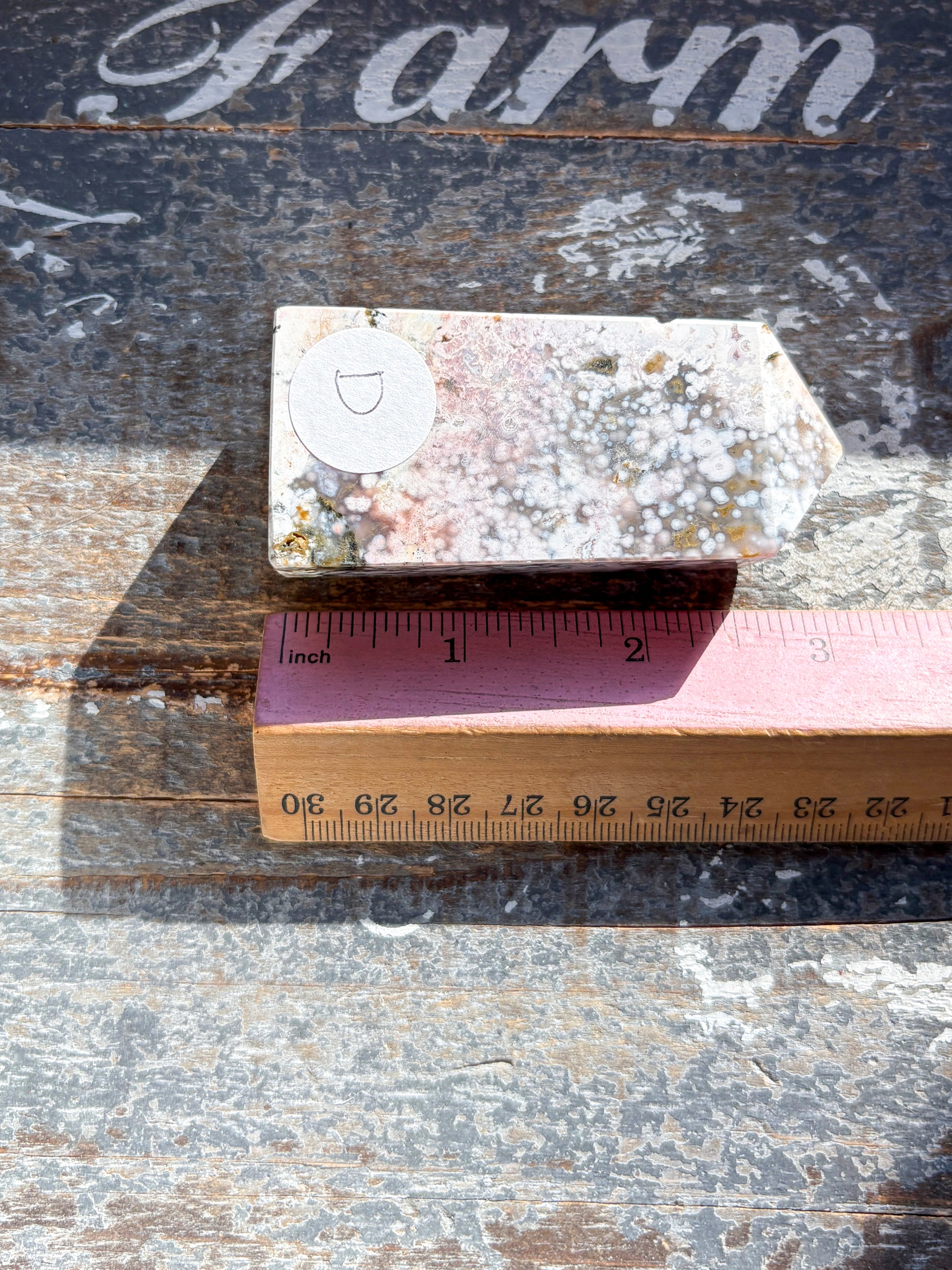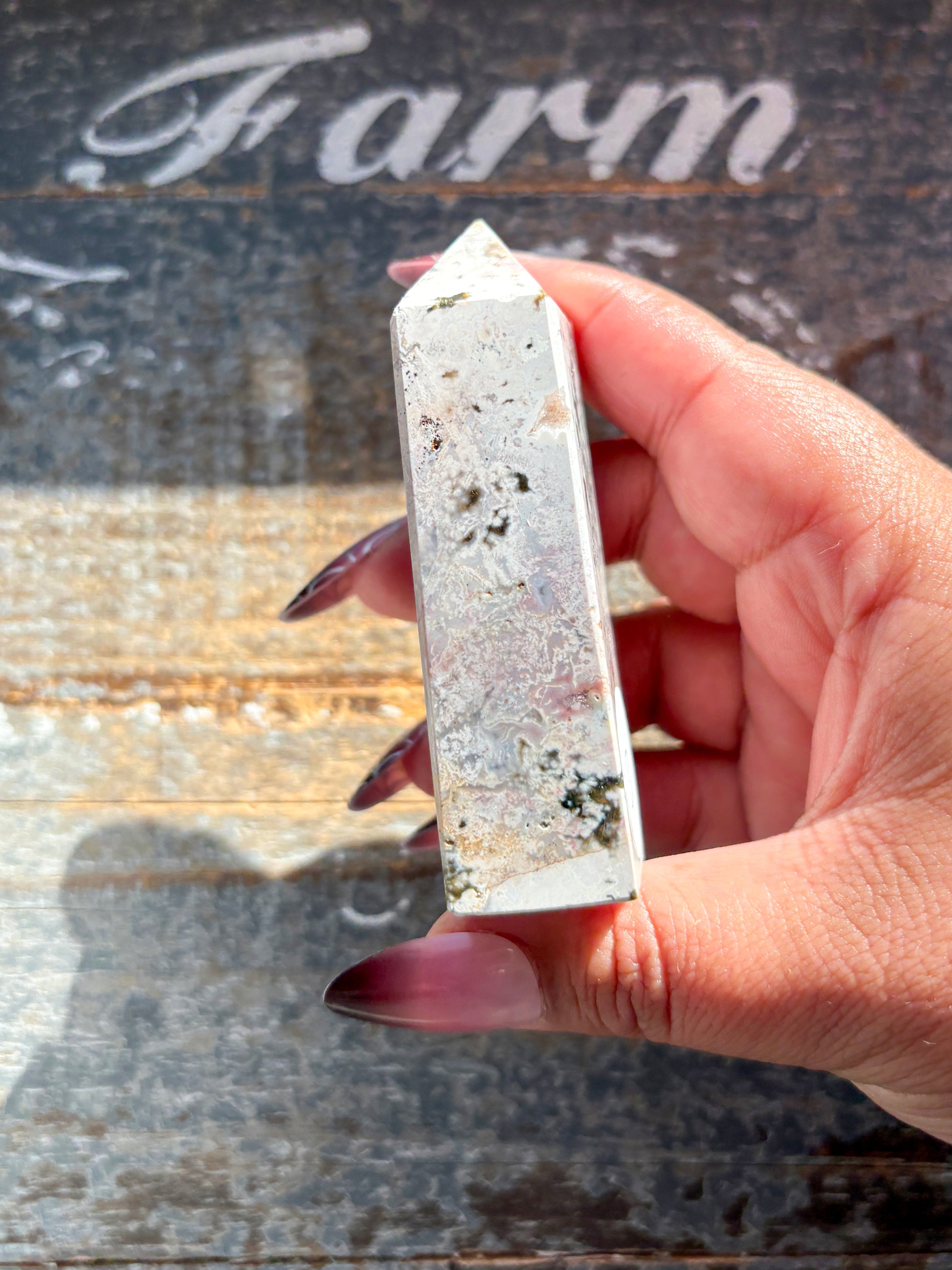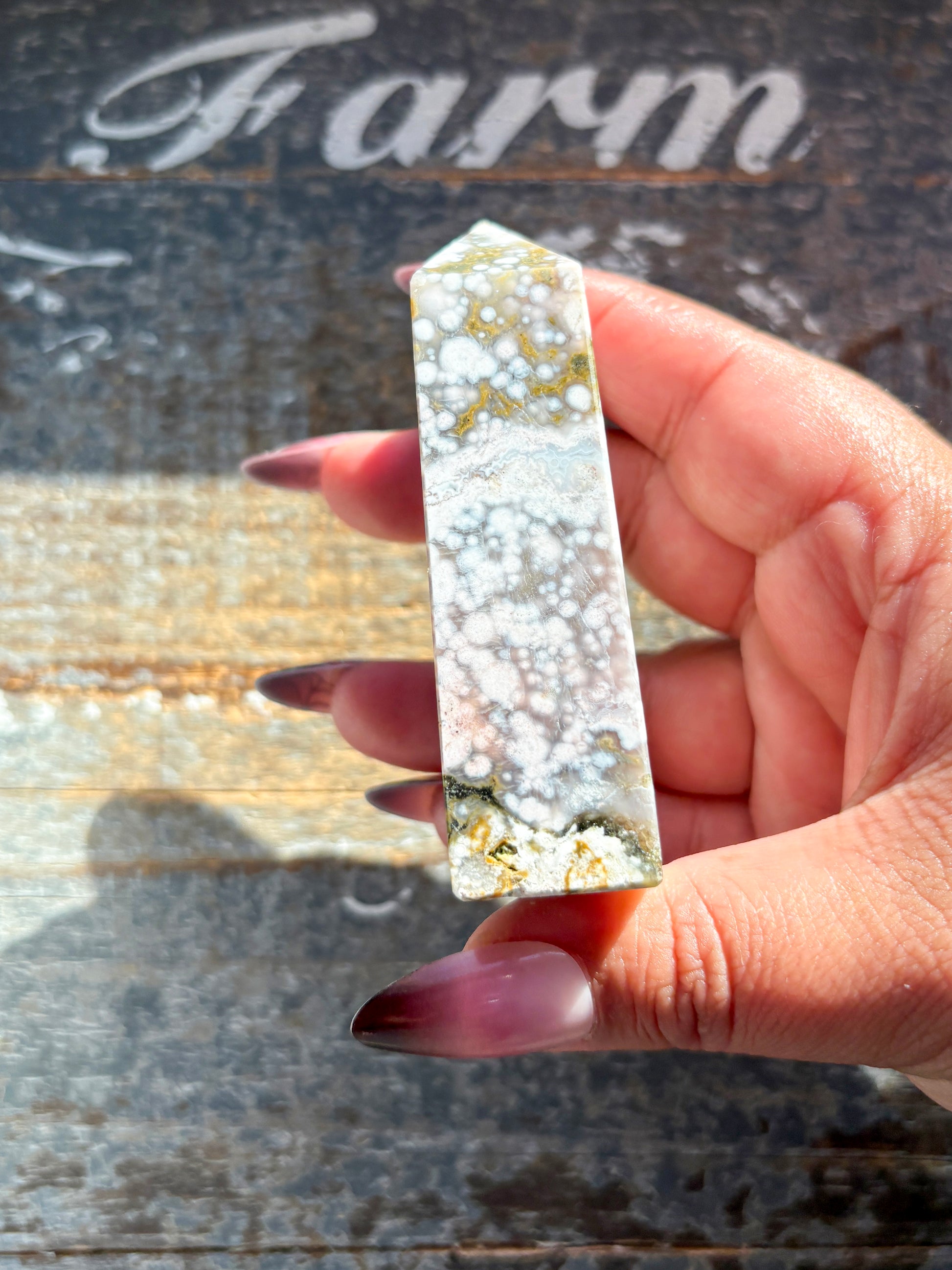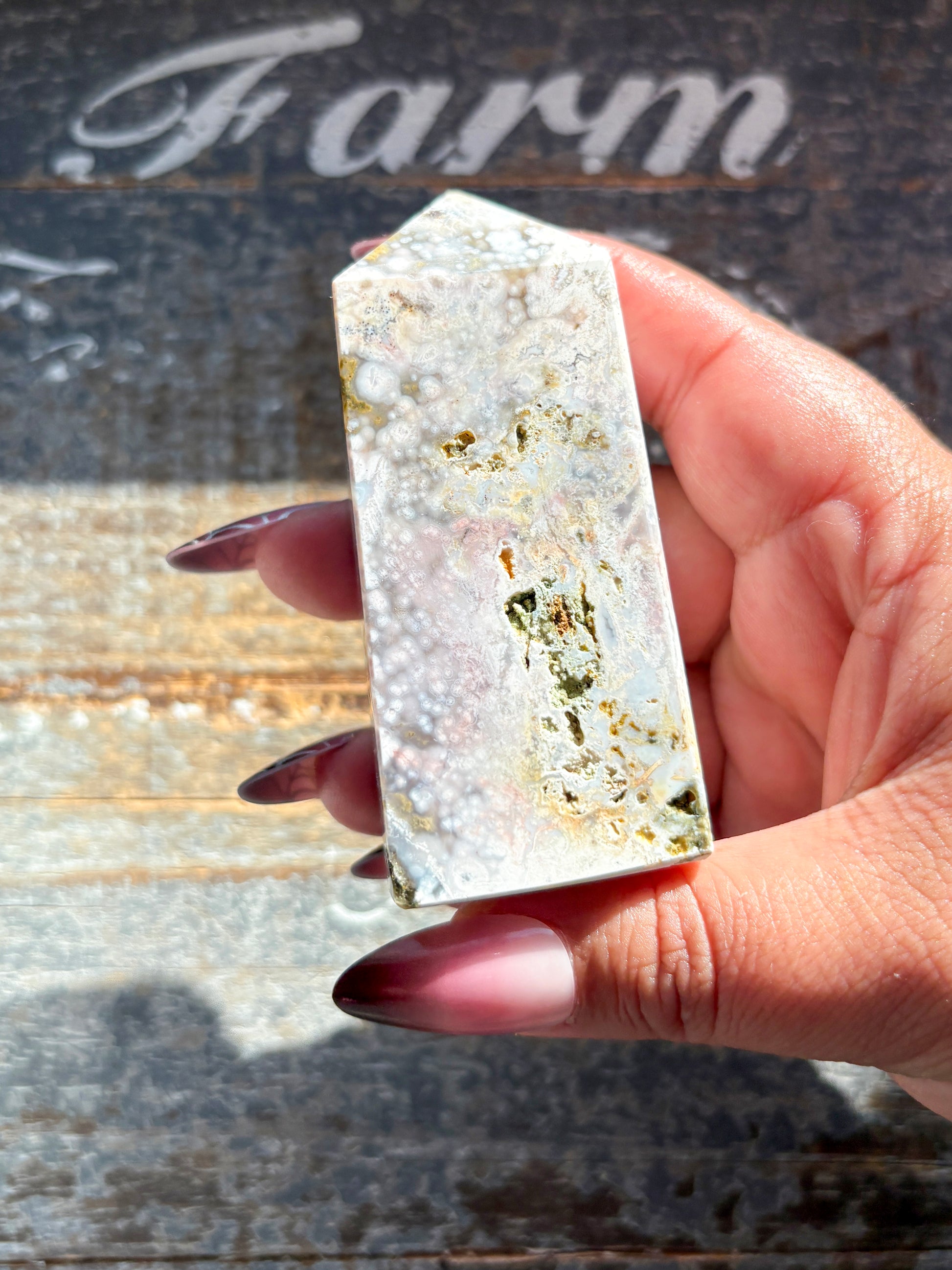 This exquisite Ocean Jasper Tower is a true treasure for collectors, sourced from the remote shores of Madagascar. Its stunning array of colors, combined with the intricate orbs unique to authentic Ocean Jasper, sets this piece apart as a rare find. These mesmerizing orbs are a hallmark of its authenticity and significantly enhance its value and rarity.