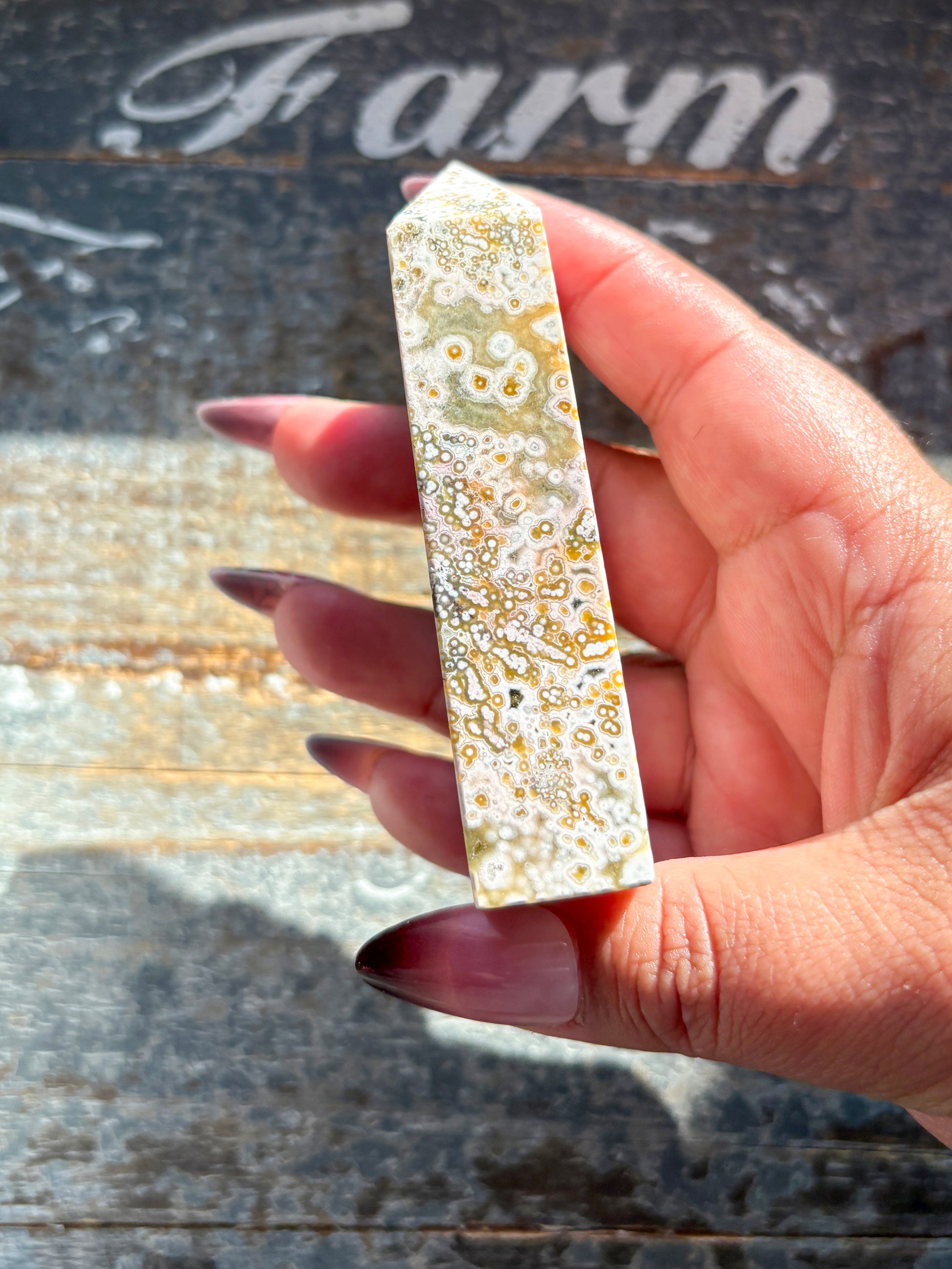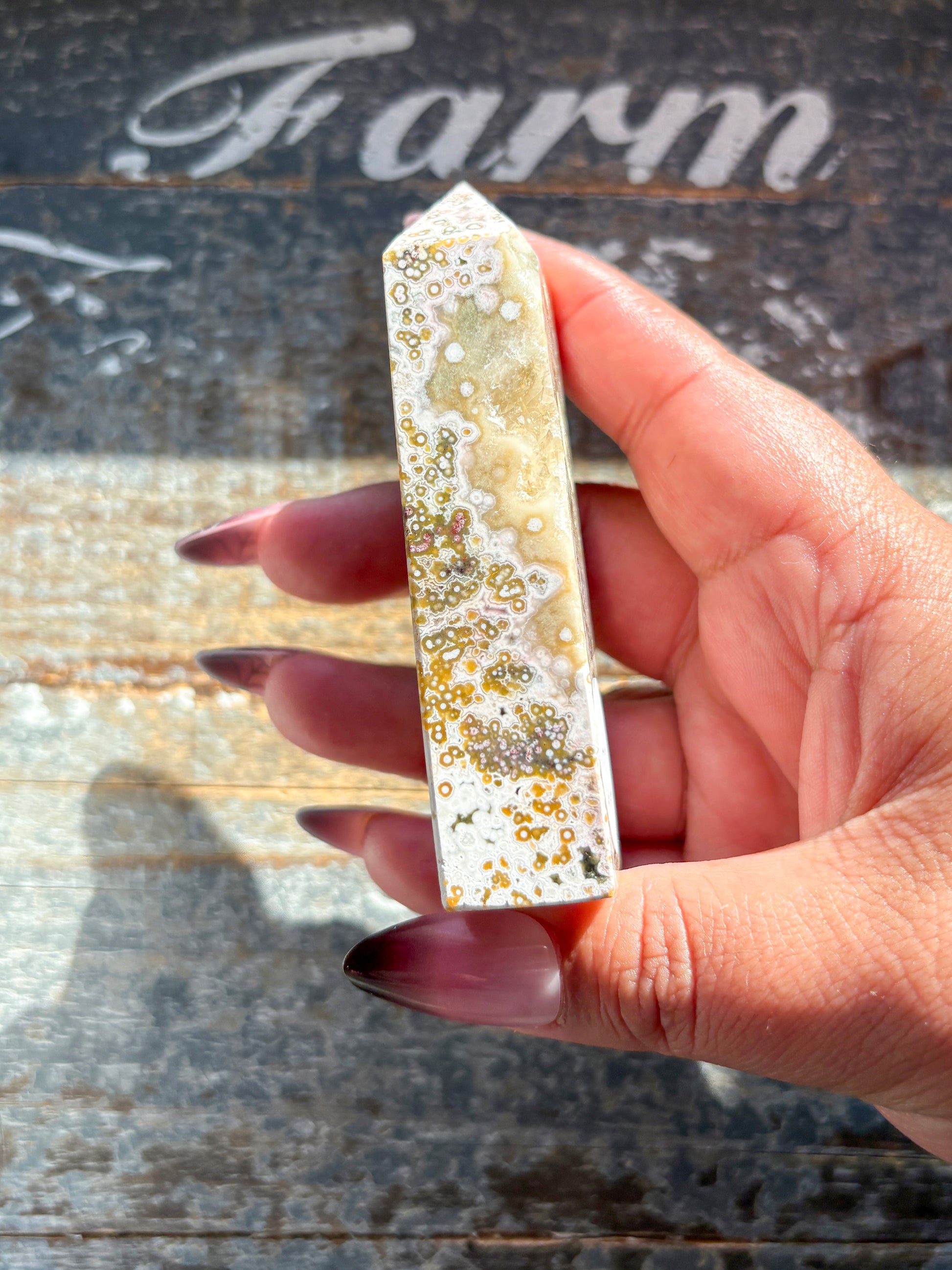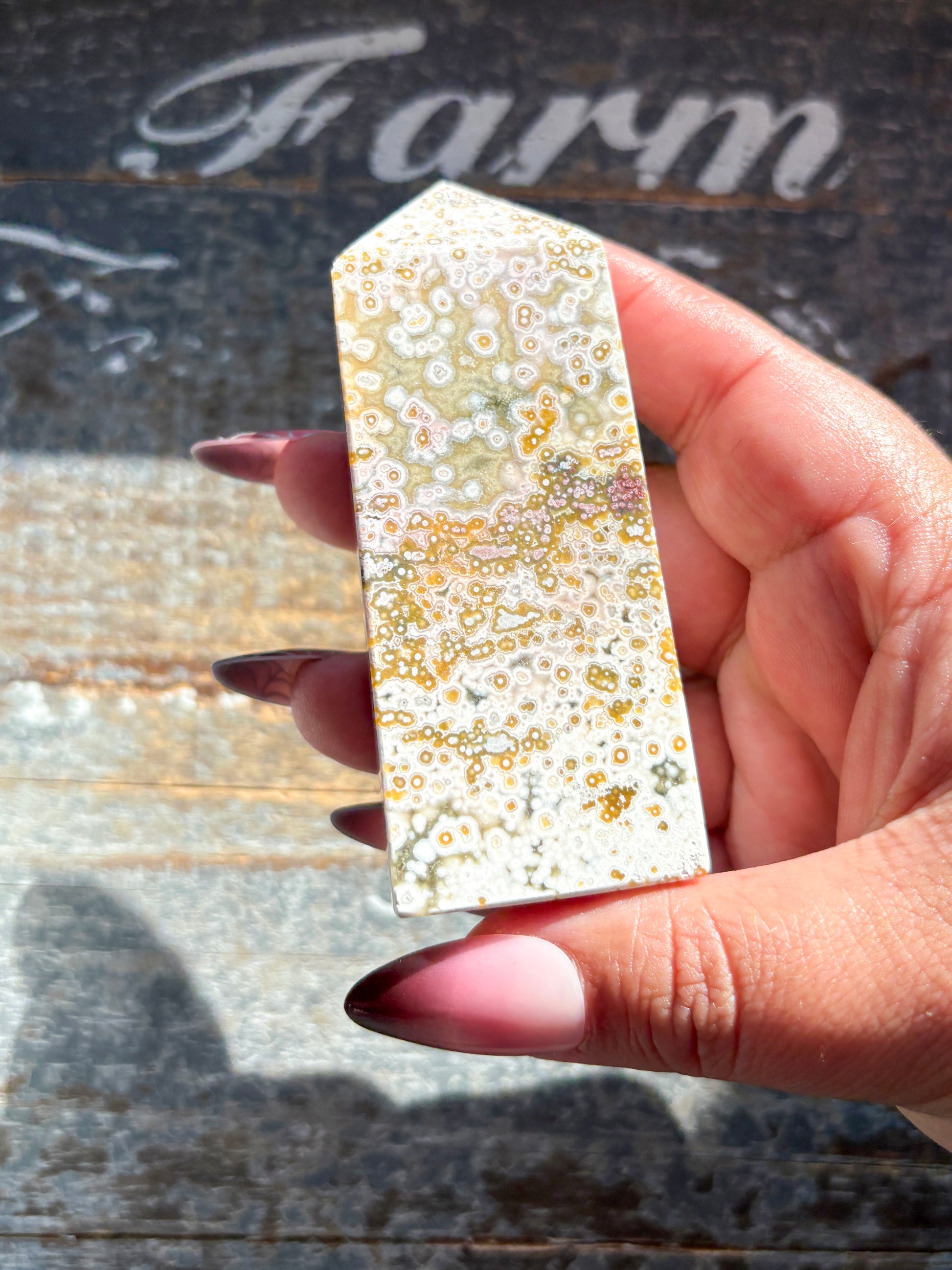 Ocean Jasper of this caliber, with such vibrant hues and well-defined orbs, is becoming increasingly scarce. Perfect for display, meditation, or elevating your crystal collection, this tower is not only a visual masterpiece but also a testament to the rarity and allure of genuine Ocean Jasper.