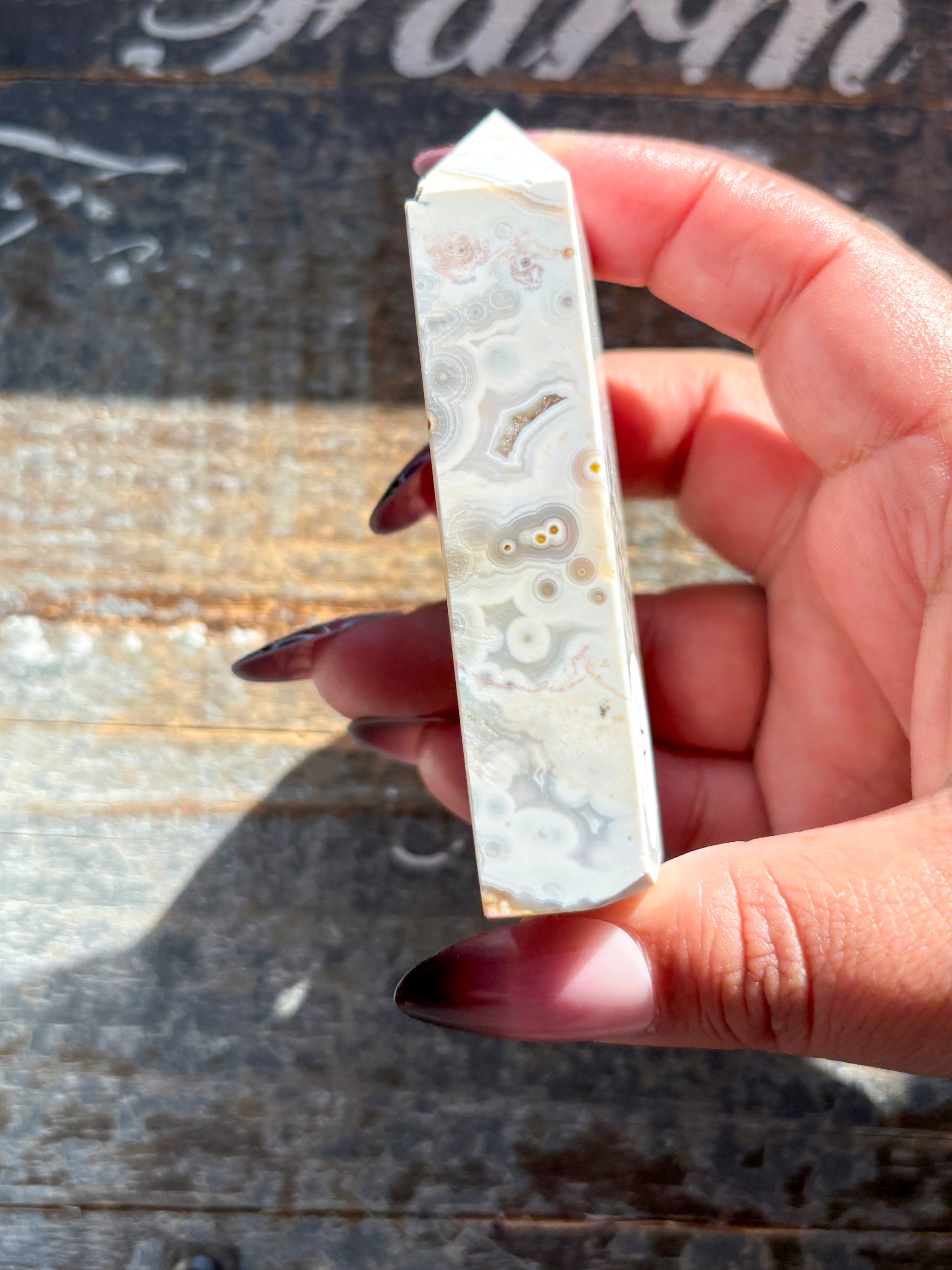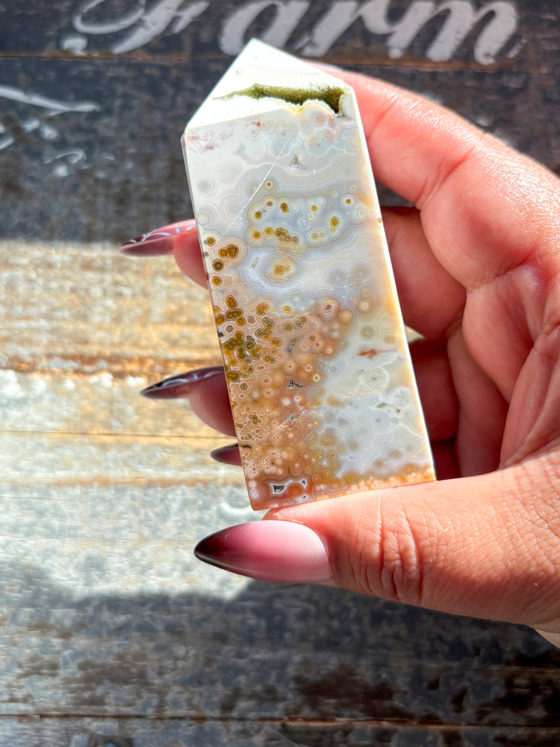 This exquisite Ocean Jasper Tower is a true treasure for collectors, sourced from the remote shores of Madagascar. Its stunning array of colors, combined with the intricate orbs unique to authentic Ocean Jasper, sets this piece apart as a rare find. These mesmerizing orbs are a hallmark of its authenticity and significantly enhance its value and rarity.
