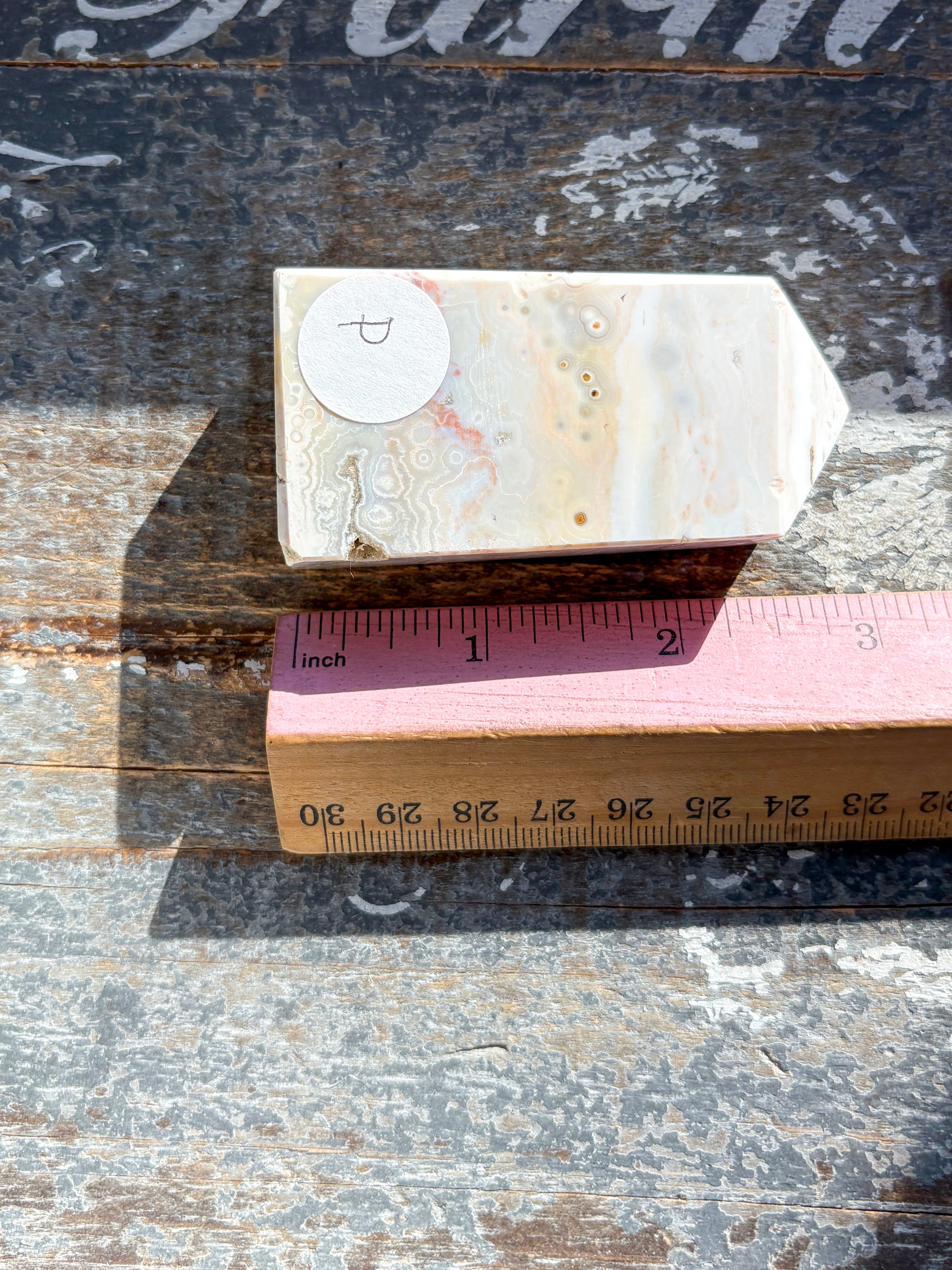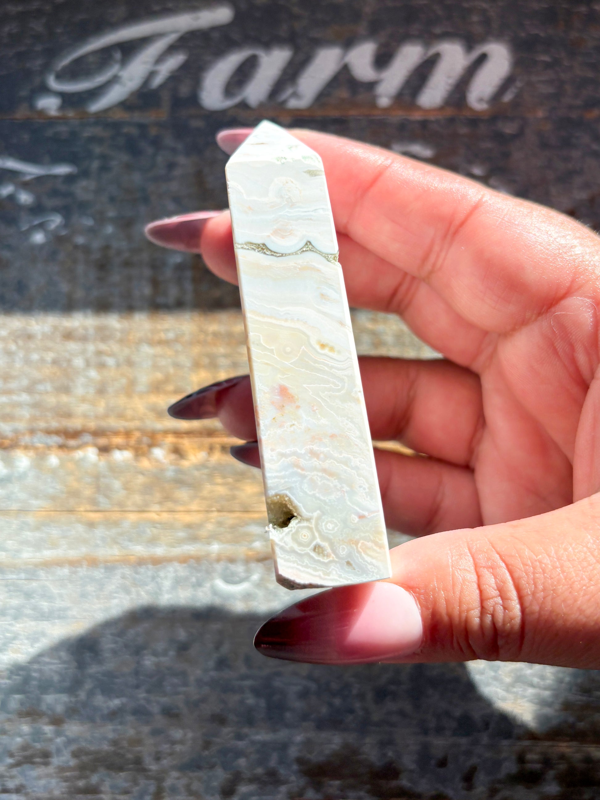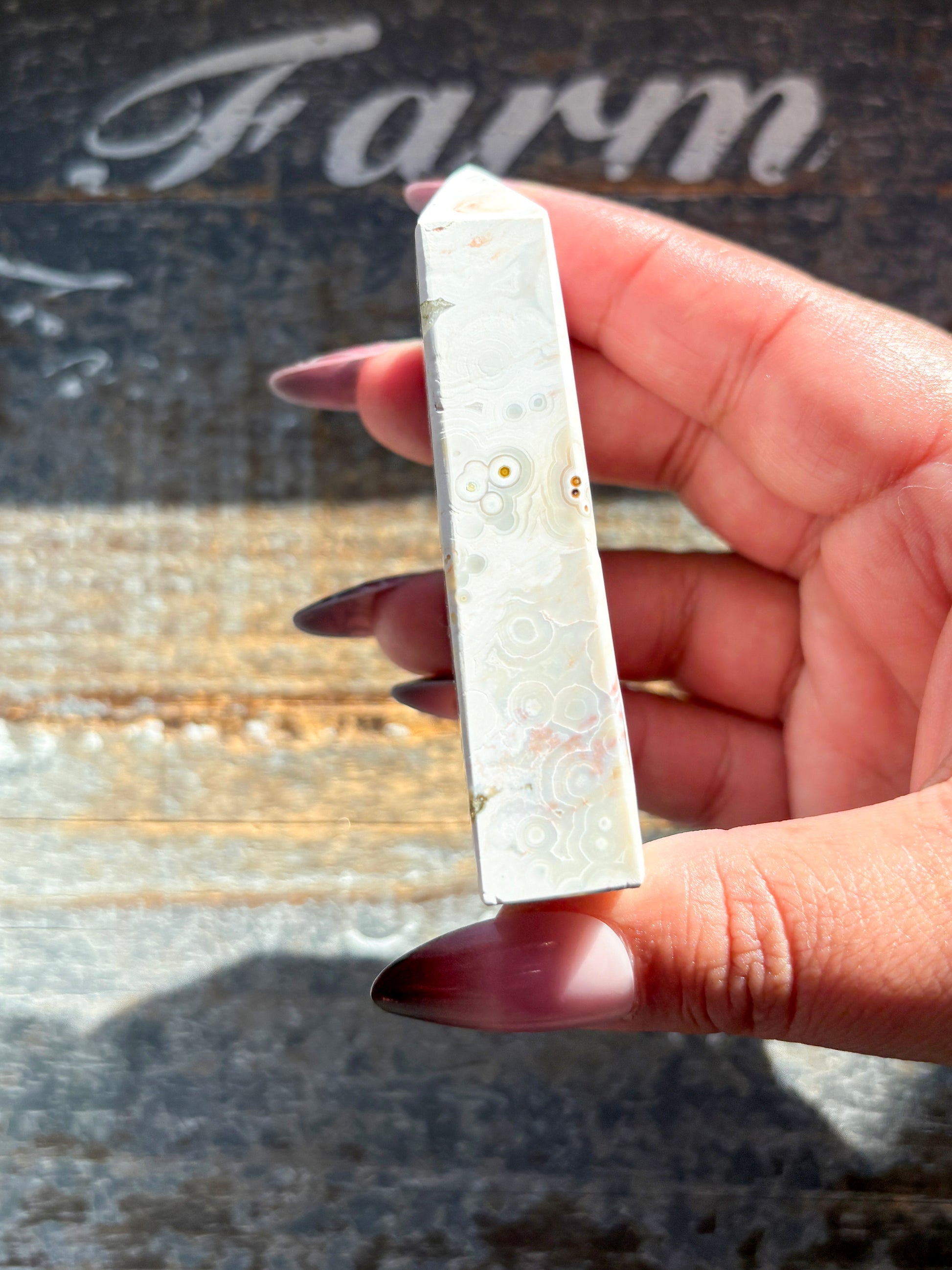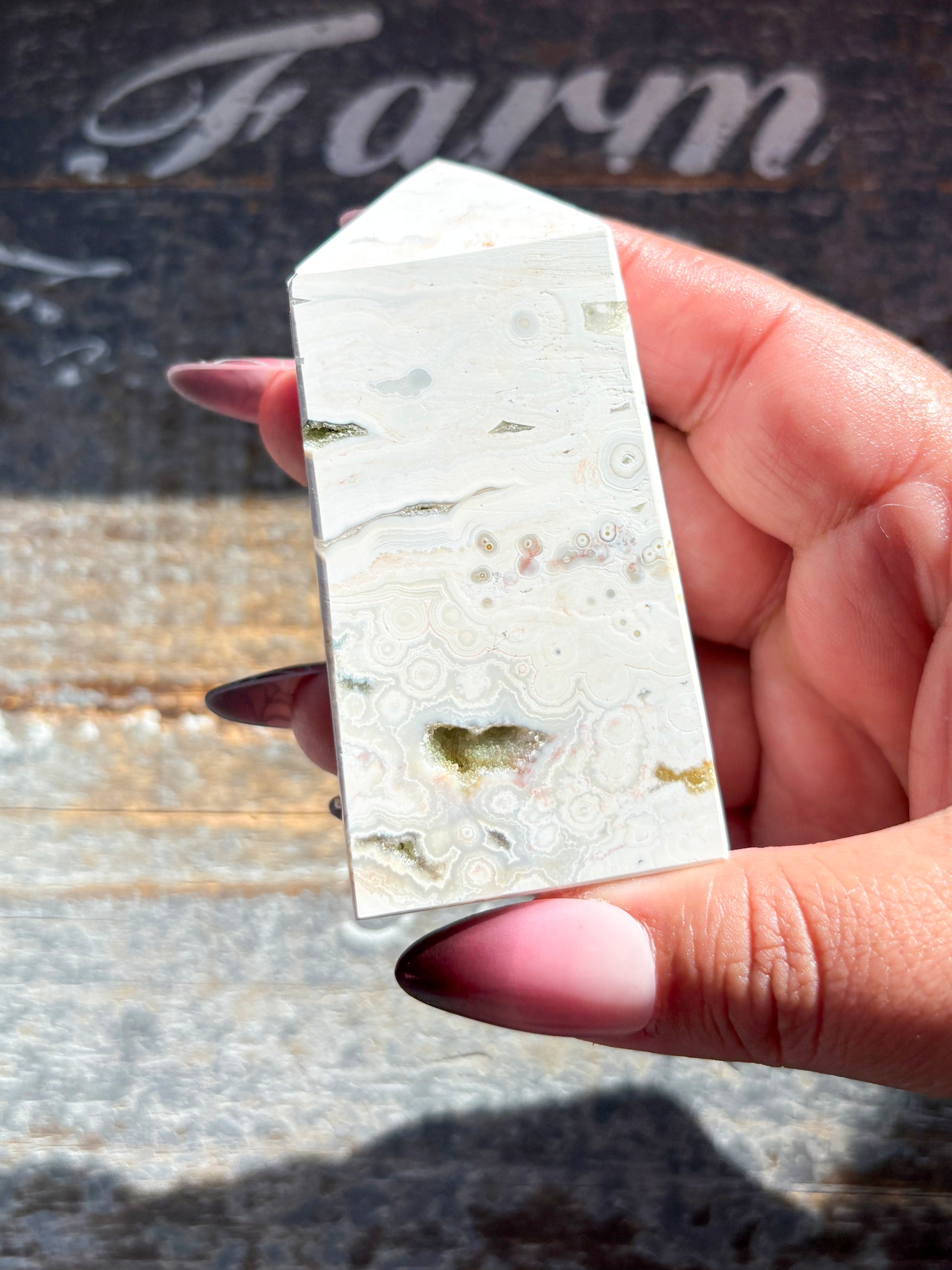 This exquisite Ocean Jasper Tower is a true treasure for collectors, sourced from the remote shores of Madagascar. Its stunning array of colors, combined with the intricate orbs unique to authentic Ocean Jasper, sets this piece apart as a rare find. These mesmerizing orbs are a hallmark of its authenticity and significantly enhance its value and rarity.
