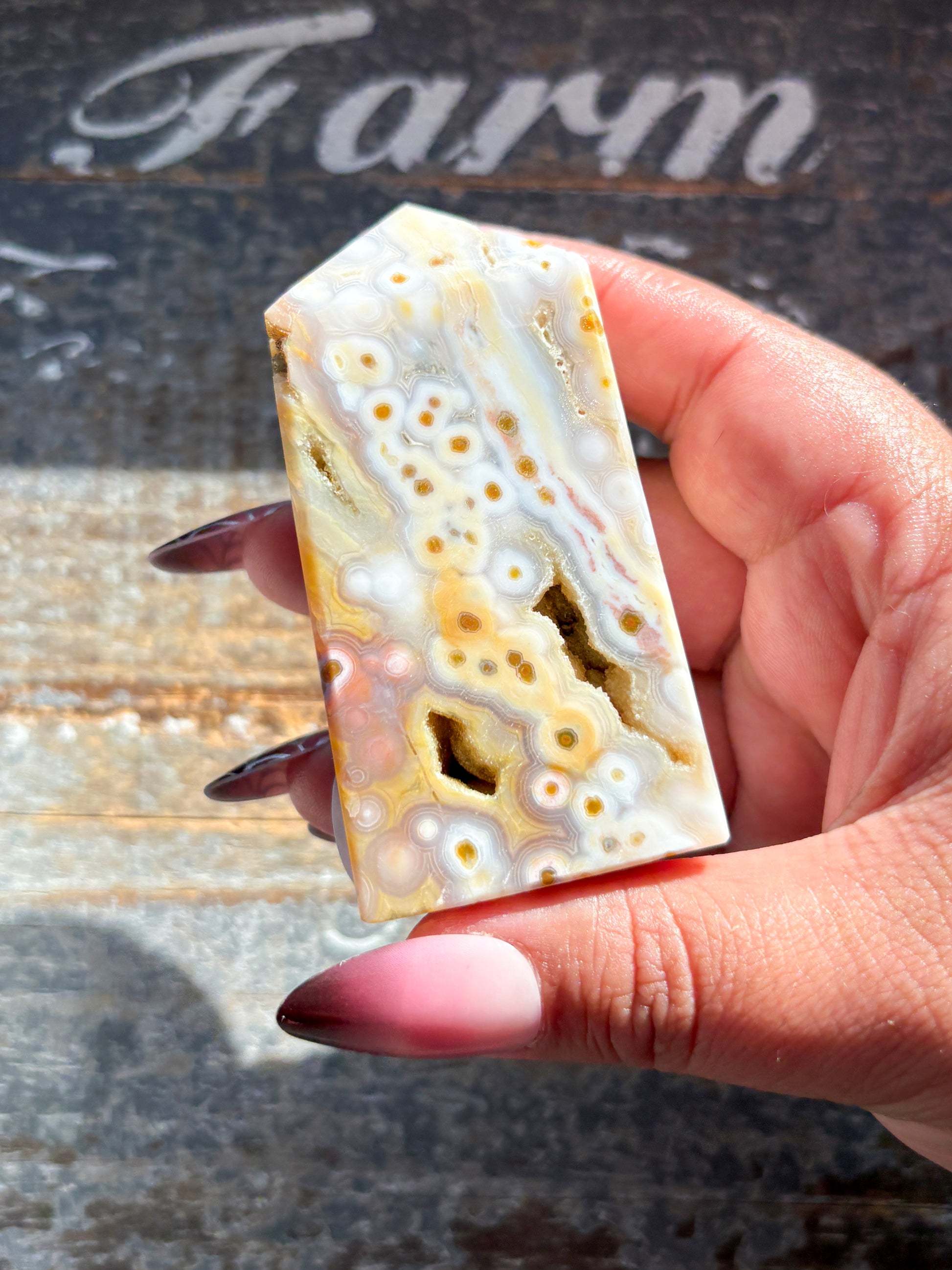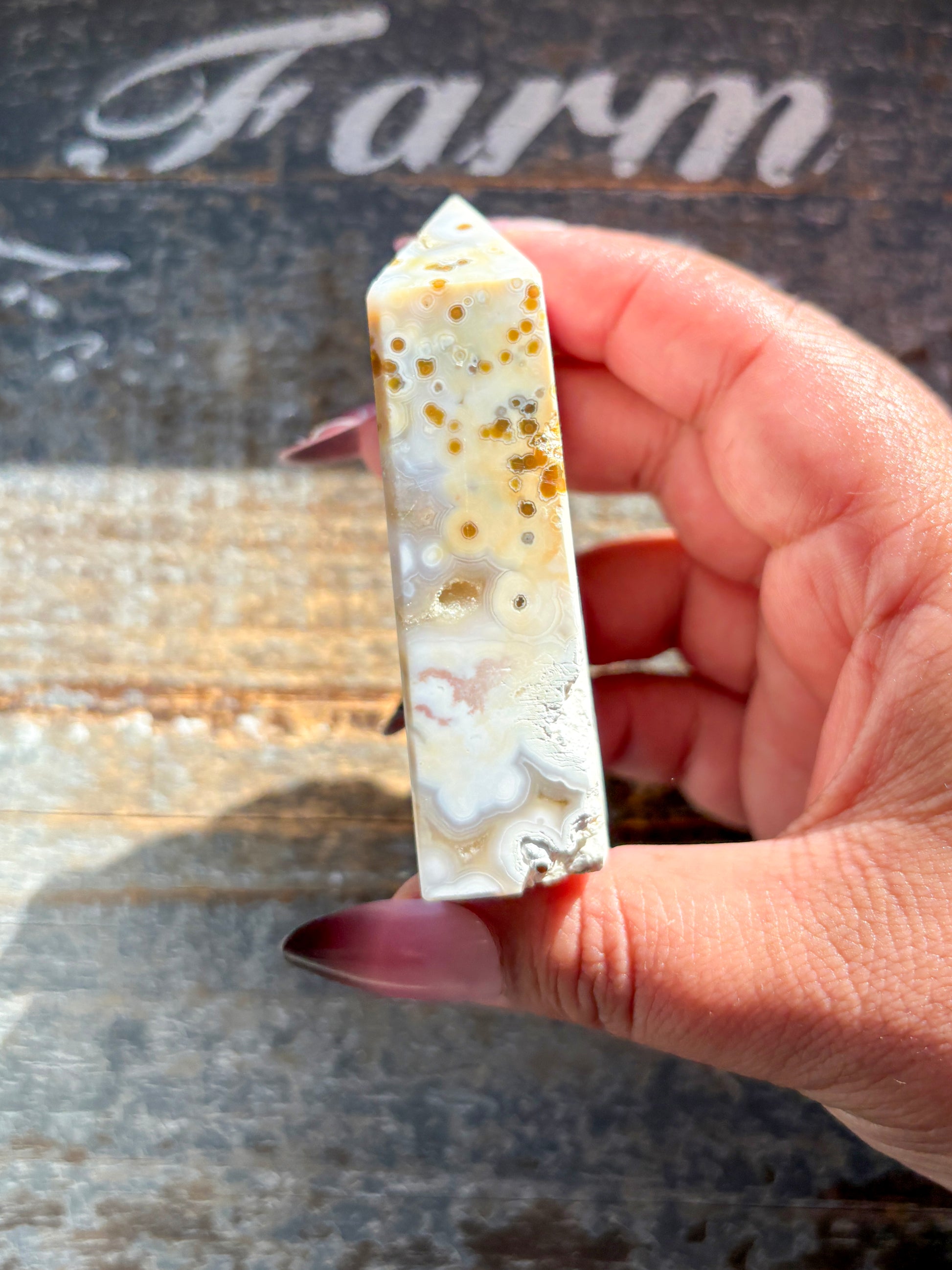 This exquisite Ocean Jasper Tower is a true treasure for collectors, sourced from the remote shores of Madagascar. Its stunning array of colors, combined with the intricate orbs unique to authentic Ocean Jasper, sets this piece apart as a rare find. These mesmerizing orbs are a hallmark of its authenticity and significantly enhance its value and rarity.