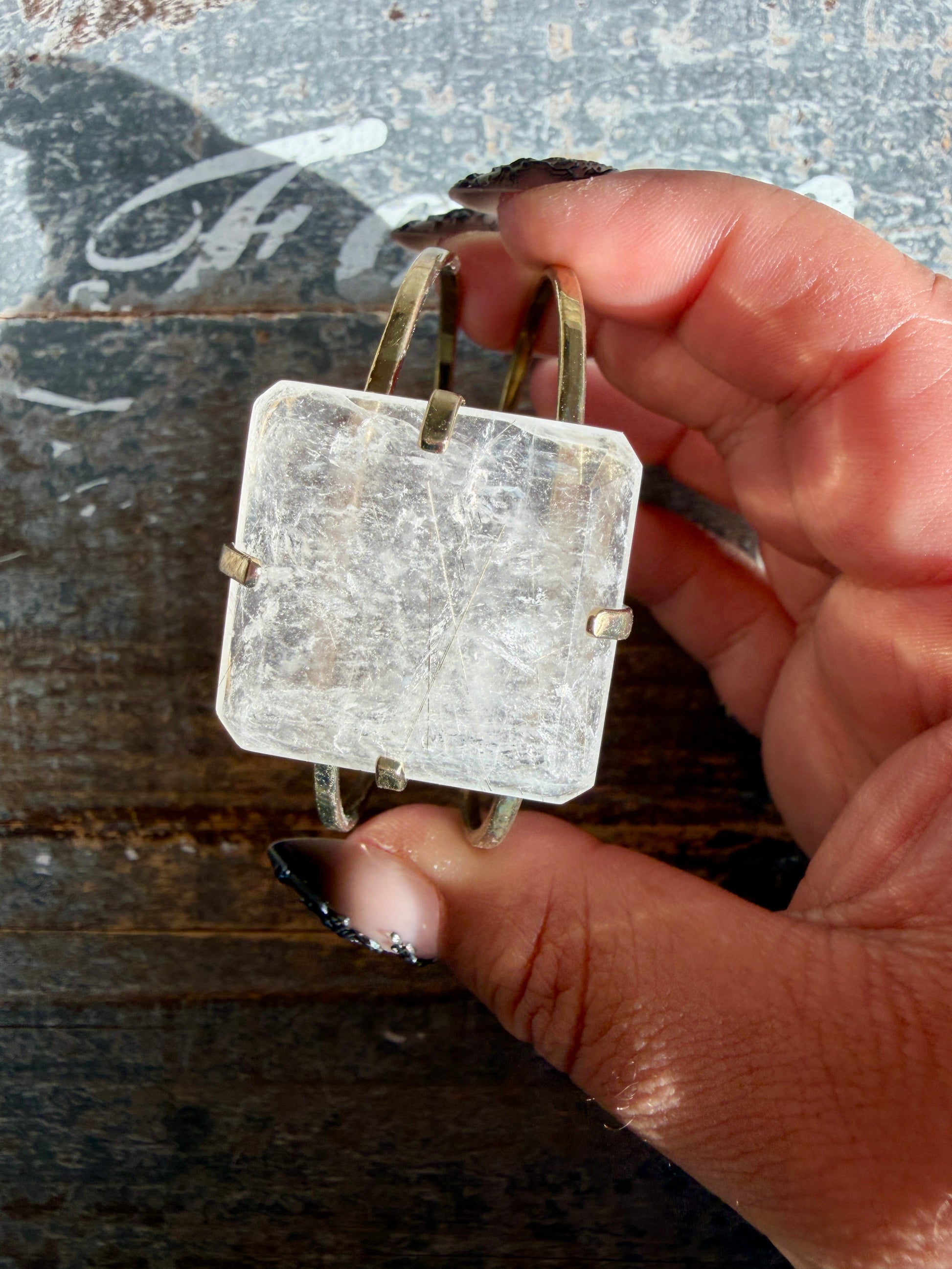 This cuff features natural Rutile in Quartz, showcasing delicate golden rutile threads suspended within clear quartz. Each inclusion formed naturally over time, creating a one-of-a-kind internal landscape—no two pieces are ever alike.