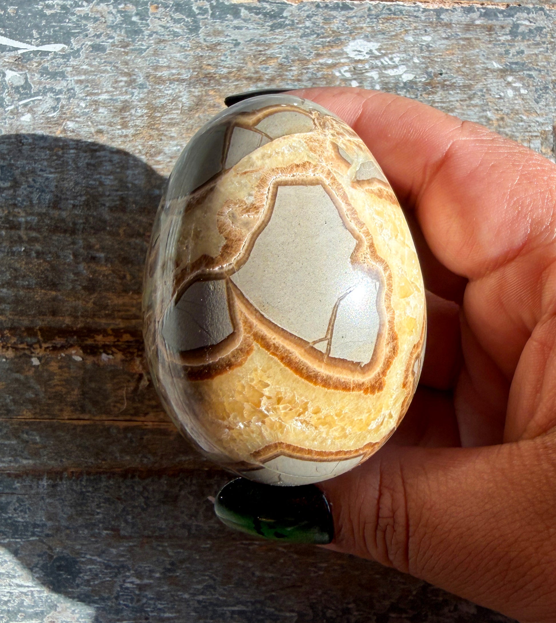 Formed over 50 million years ago, Septarian is a striking blend of calcite, aragonite, and limestone, creating intricate patterns of yellow, brown, and gray that look like ancient cracked earth. Each piece is completely unique — nature’s own mosaic of grounding energy and ancient beauty.