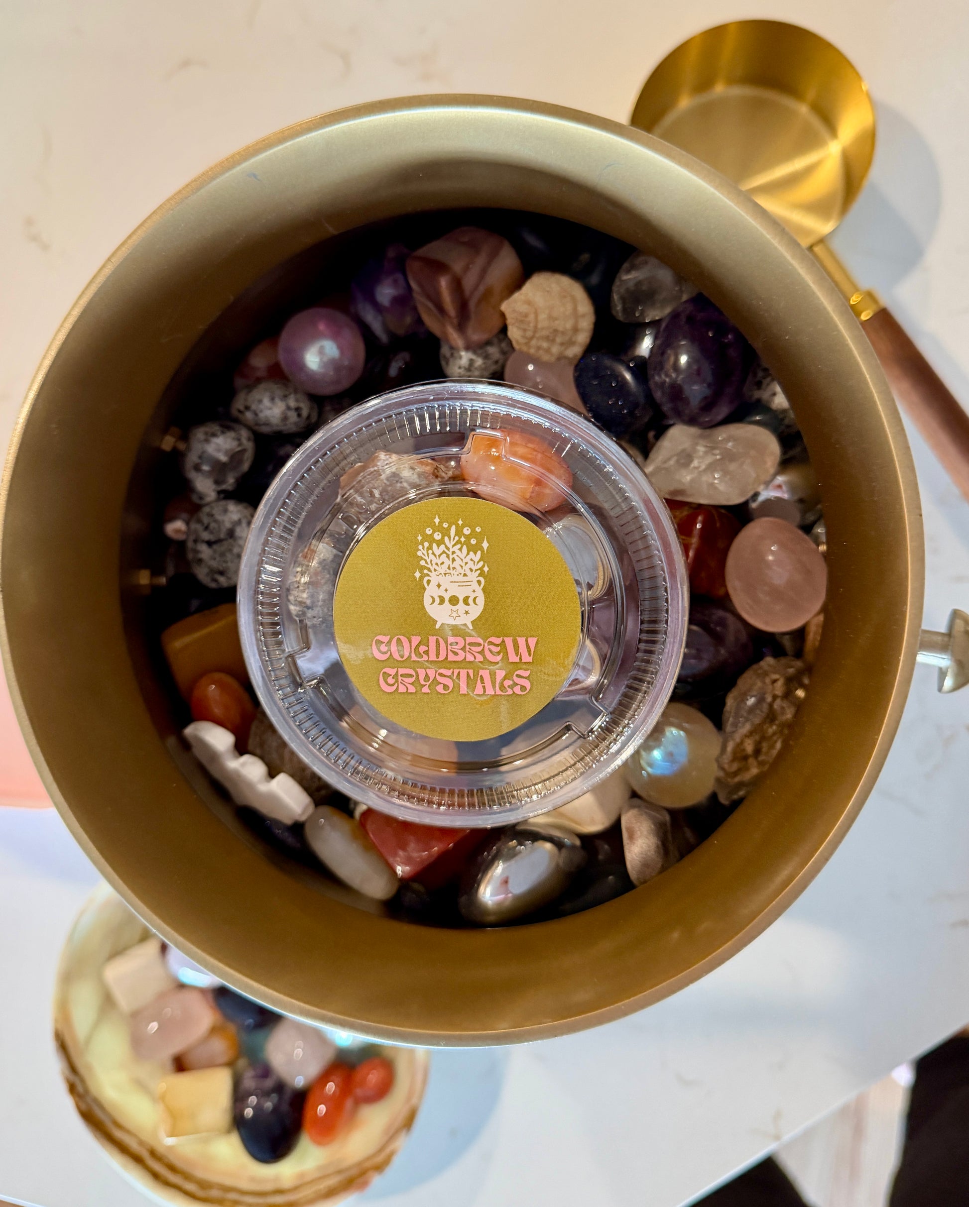 Brew a little magic into your day with our Cold Brew Cauldron crystal scoops — a 1-cup serving size filled with mystery, sparkle, and high-vibe energy. Each scoop is intuitively mixed and completely unique, featuring an enchanting blend of natural and man-made stones that make every pour feel like a spell in motion.