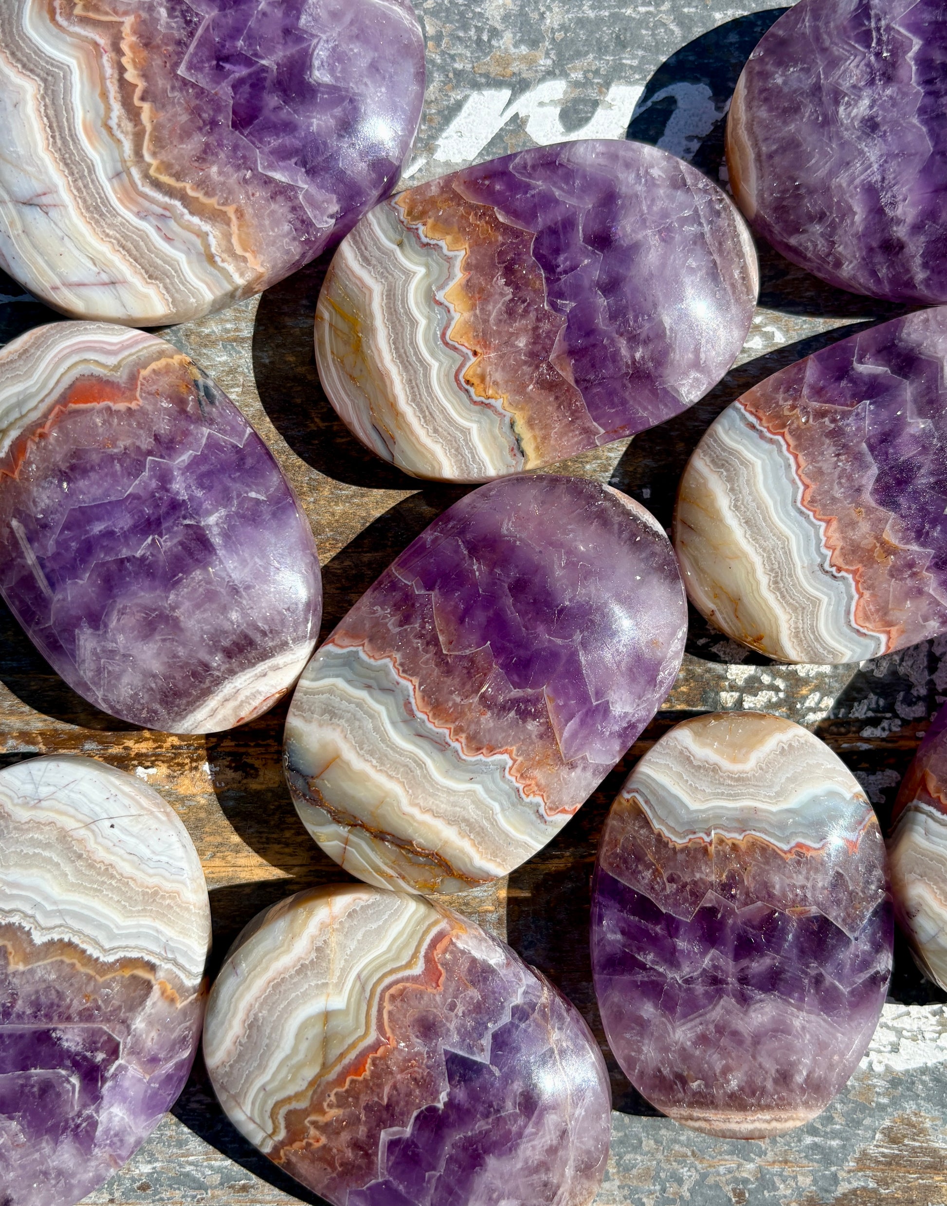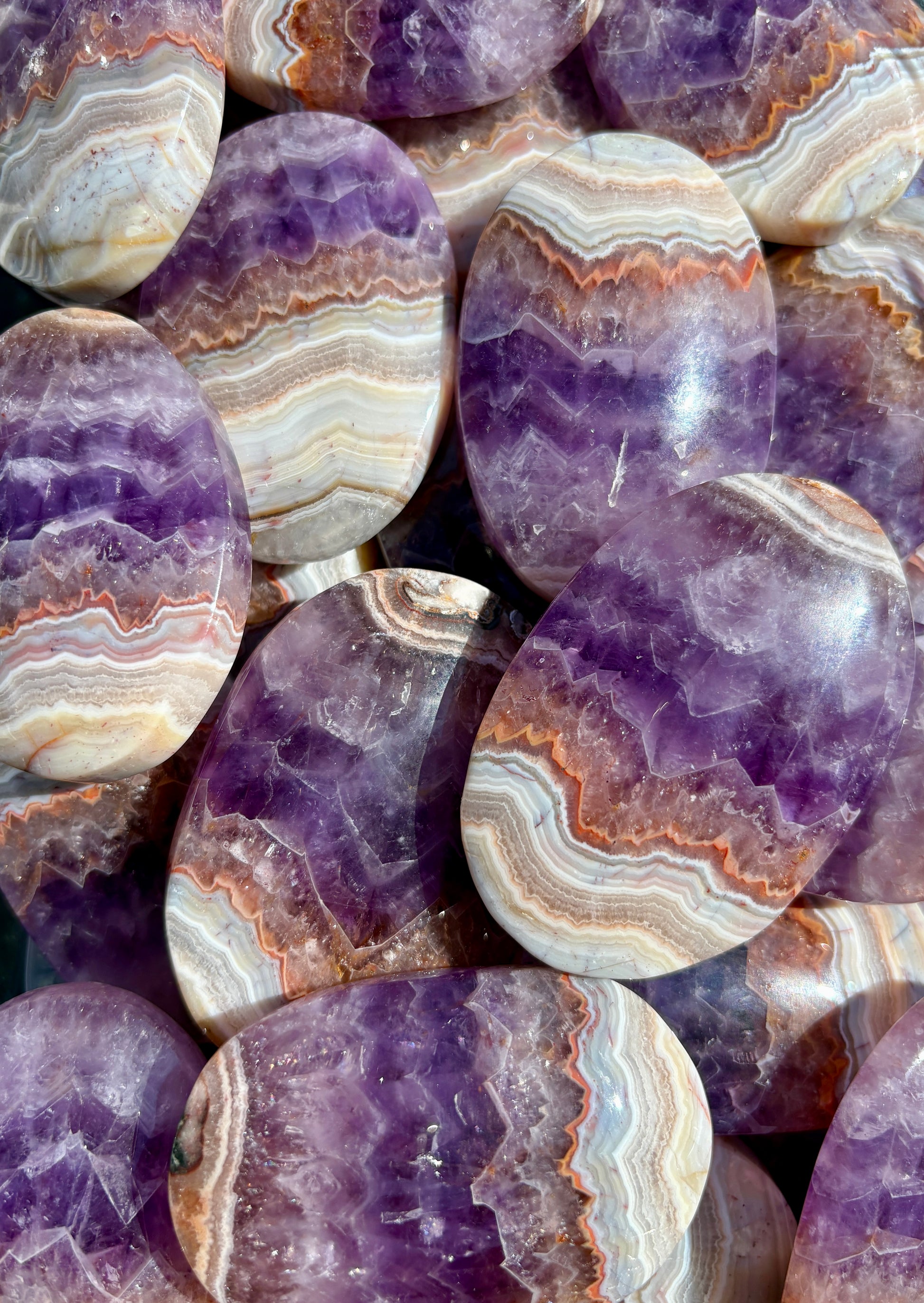 This unique crystal combines the soothing, spiritual energy of Amethyst with the grounding and protective properties of Crazy Lace Banded Agate. Each piece displays stunning, swirling bands of agate in earthy neutrals and warm tones, accented by beautiful pops of deep purple Amethyst, creating a striking and energetic balance.