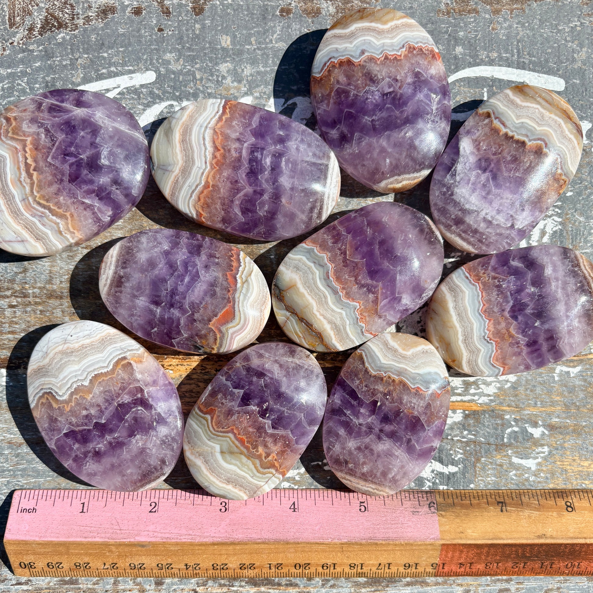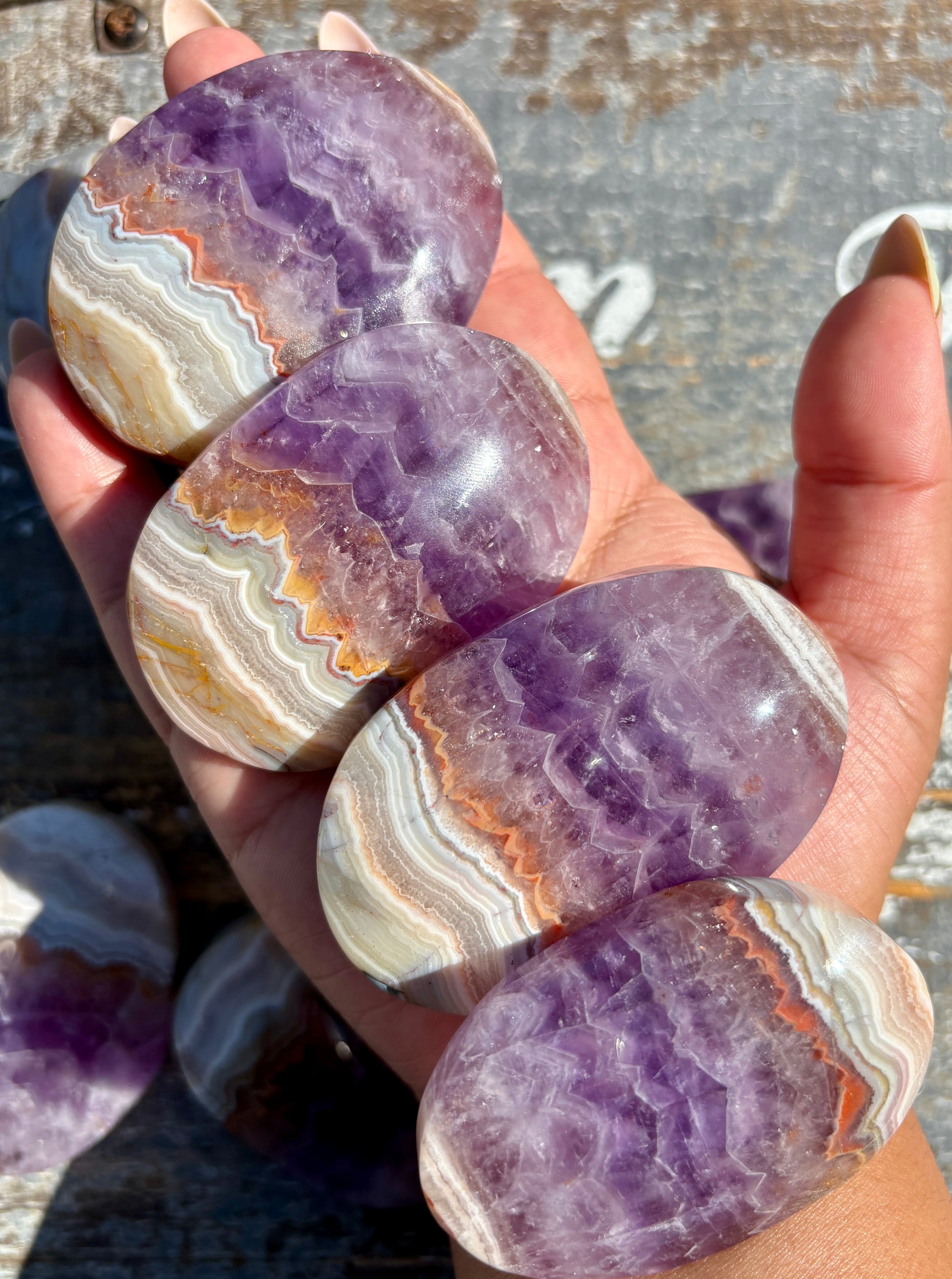 One (1) Gorgeous Amethyst with Crazy Lace Agate Banding Palm Stone | Intuitively Chosen