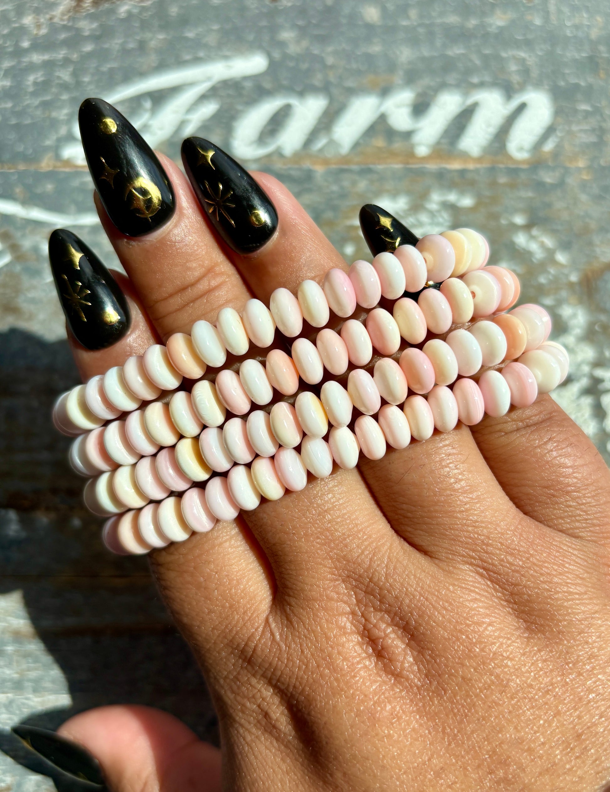 Soft, feminine, and timeless—Queen Conch bracelets carry the serene beauty of the sea. Made from natural conch shell, each piece features delicate pink hues that evoke tranquility, love, and emotional healing. Often associated with the divine feminine, Queen Conch is believed to soothe the heart, enhance intuition, and encourage graceful self-expression. Wear it as a gentle reminder to move with calm, confidence, and the rhythm of your own inner tide.