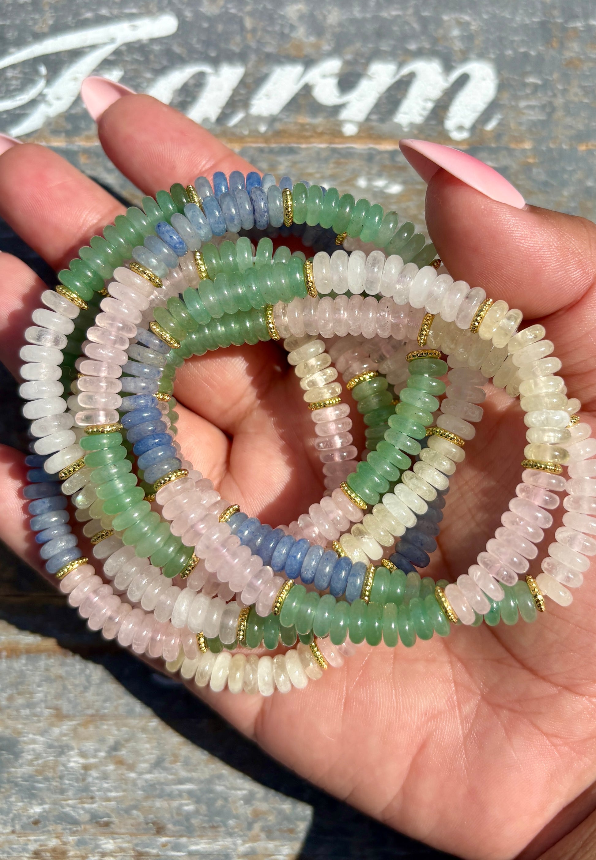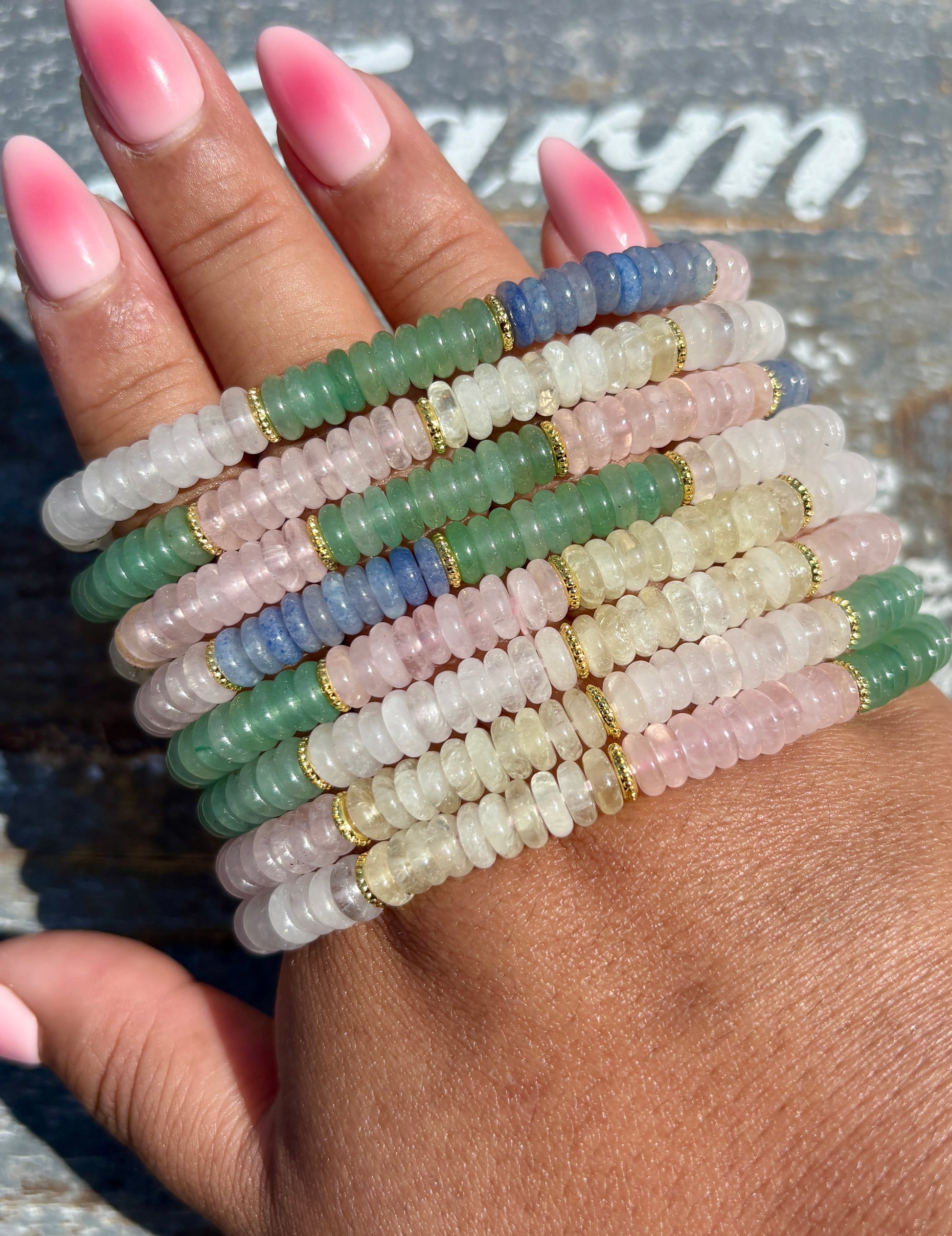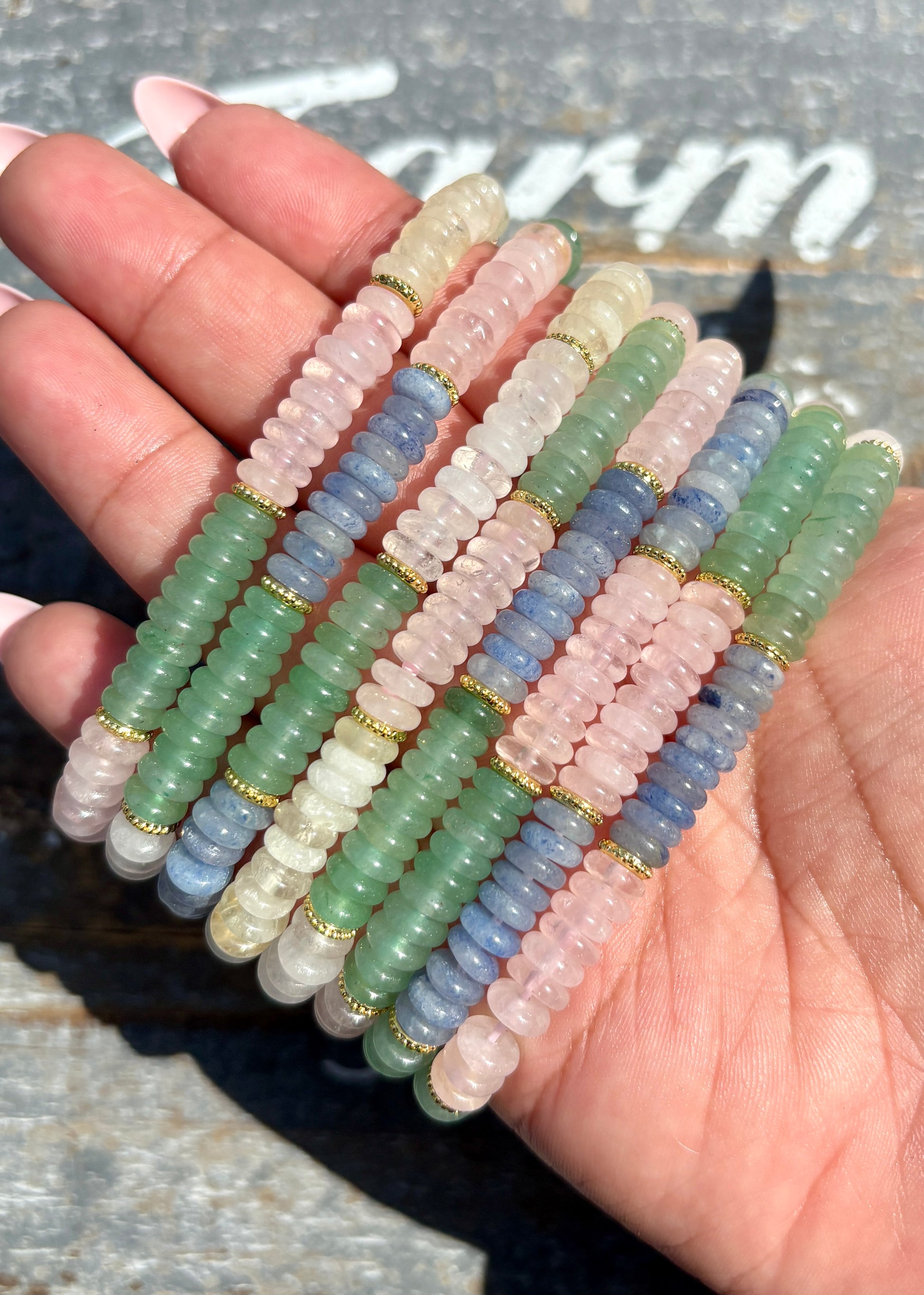 This vibrant bracelet combines Green Aventurine, Blue Aventurine, Clear Quartz, Rose Quartz, and Citrine — a powerful harmony of crystals for balance, positivity, and manifestation. Together, they attract abundance, soothe the heart, uplift your mood, and amplify your intentions, making it the perfect everyday energy companion.