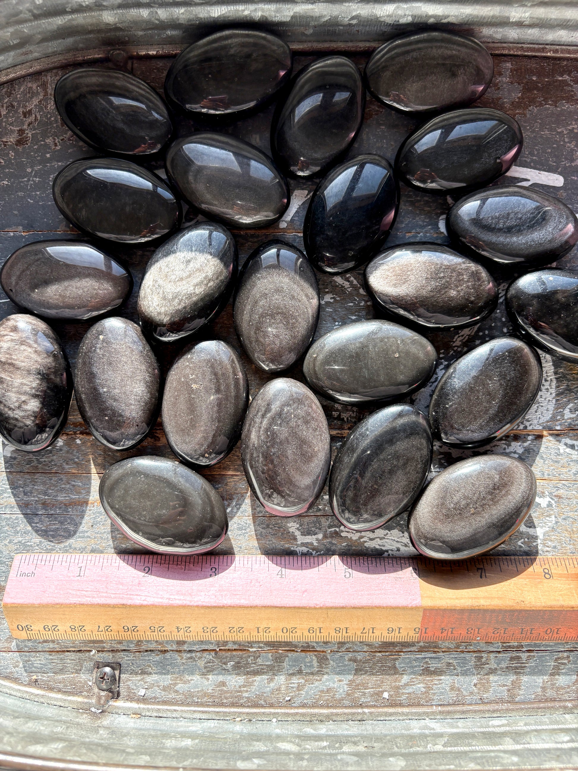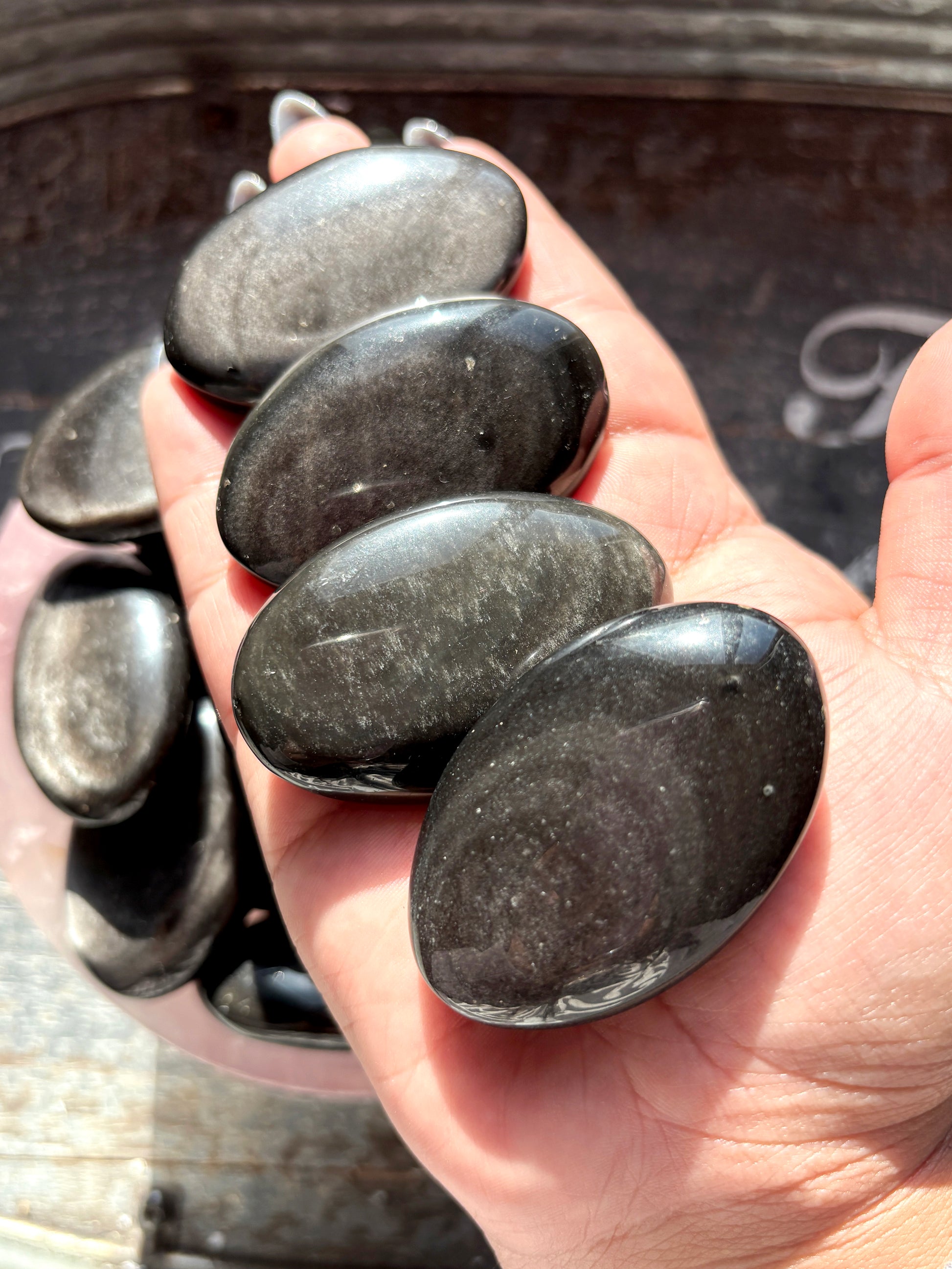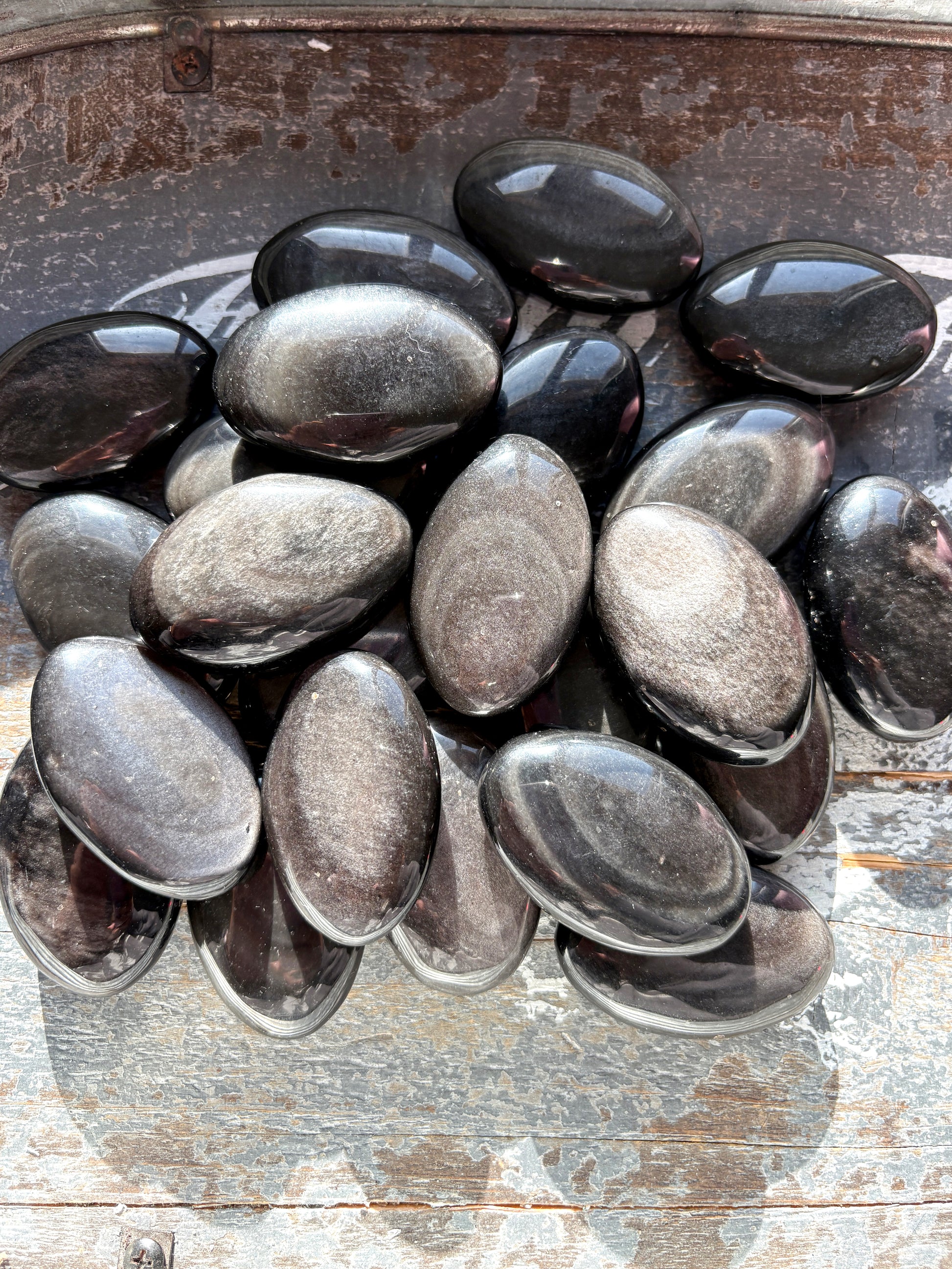 One (1) Silver Sheen Obsidian Palmstone from Mexico, Intuitively Chosen