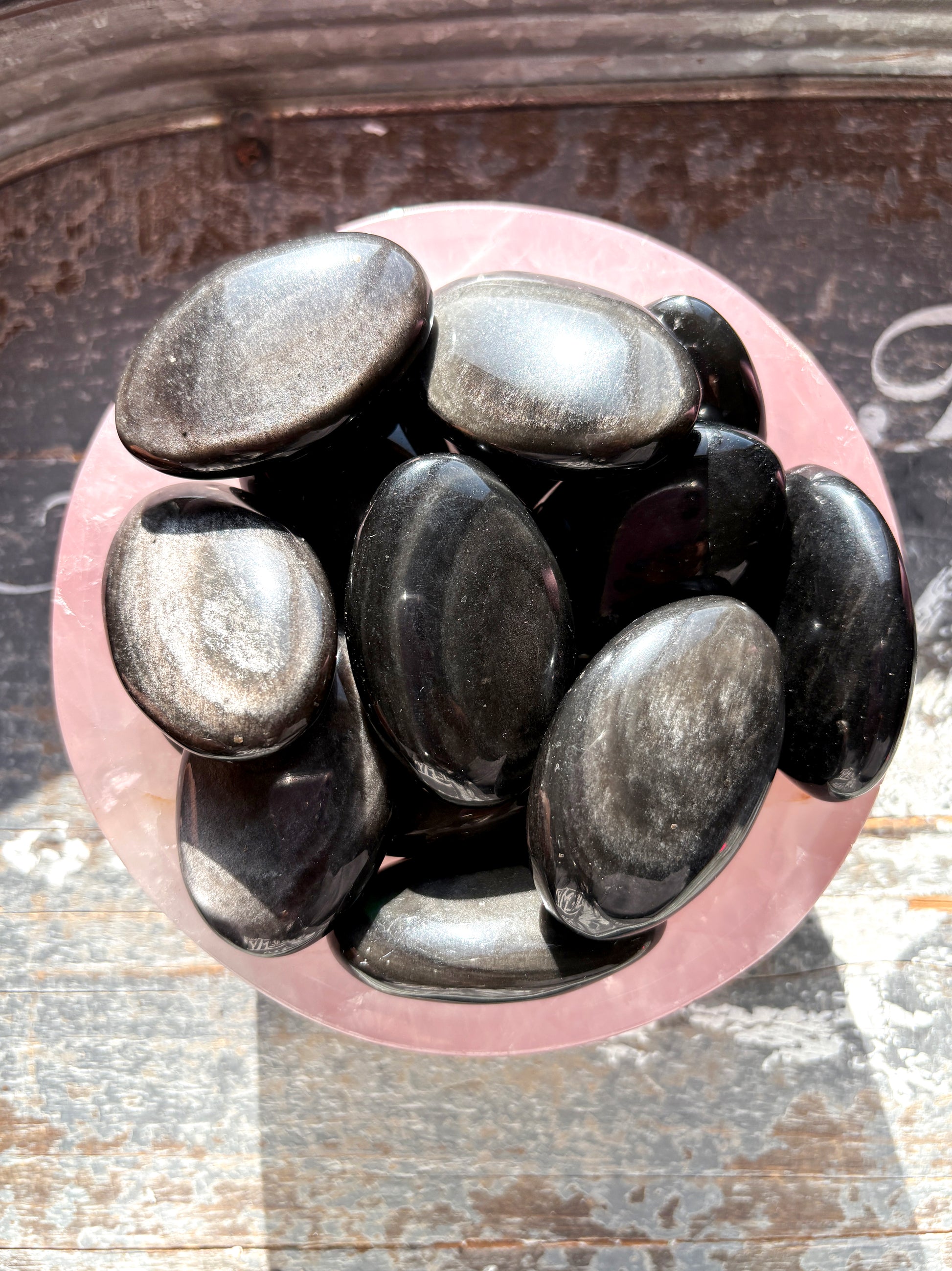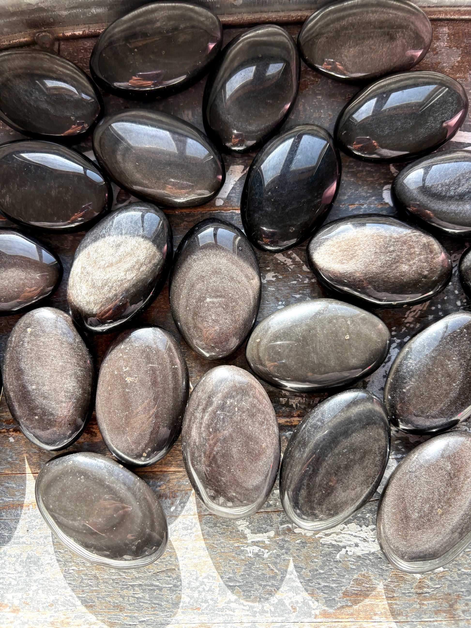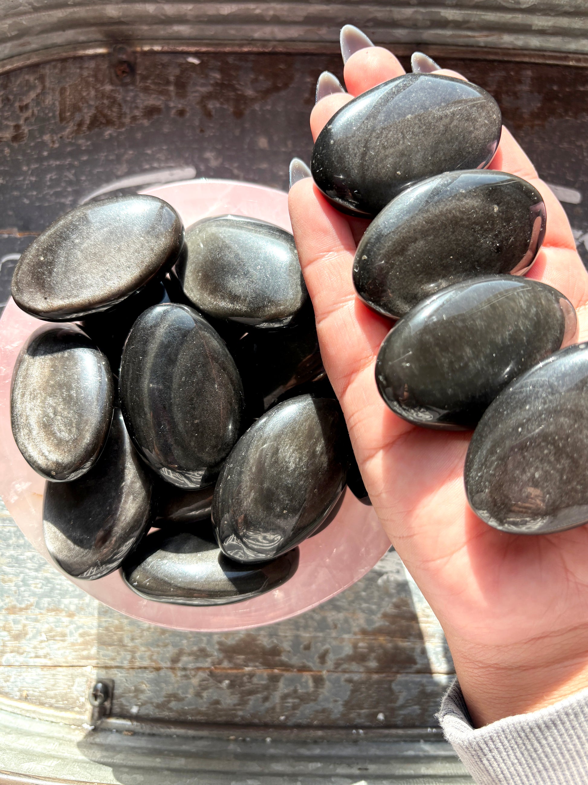 One (1) Silver Sheen Obsidian Palmstone from Mexico, Intuitively Chosen