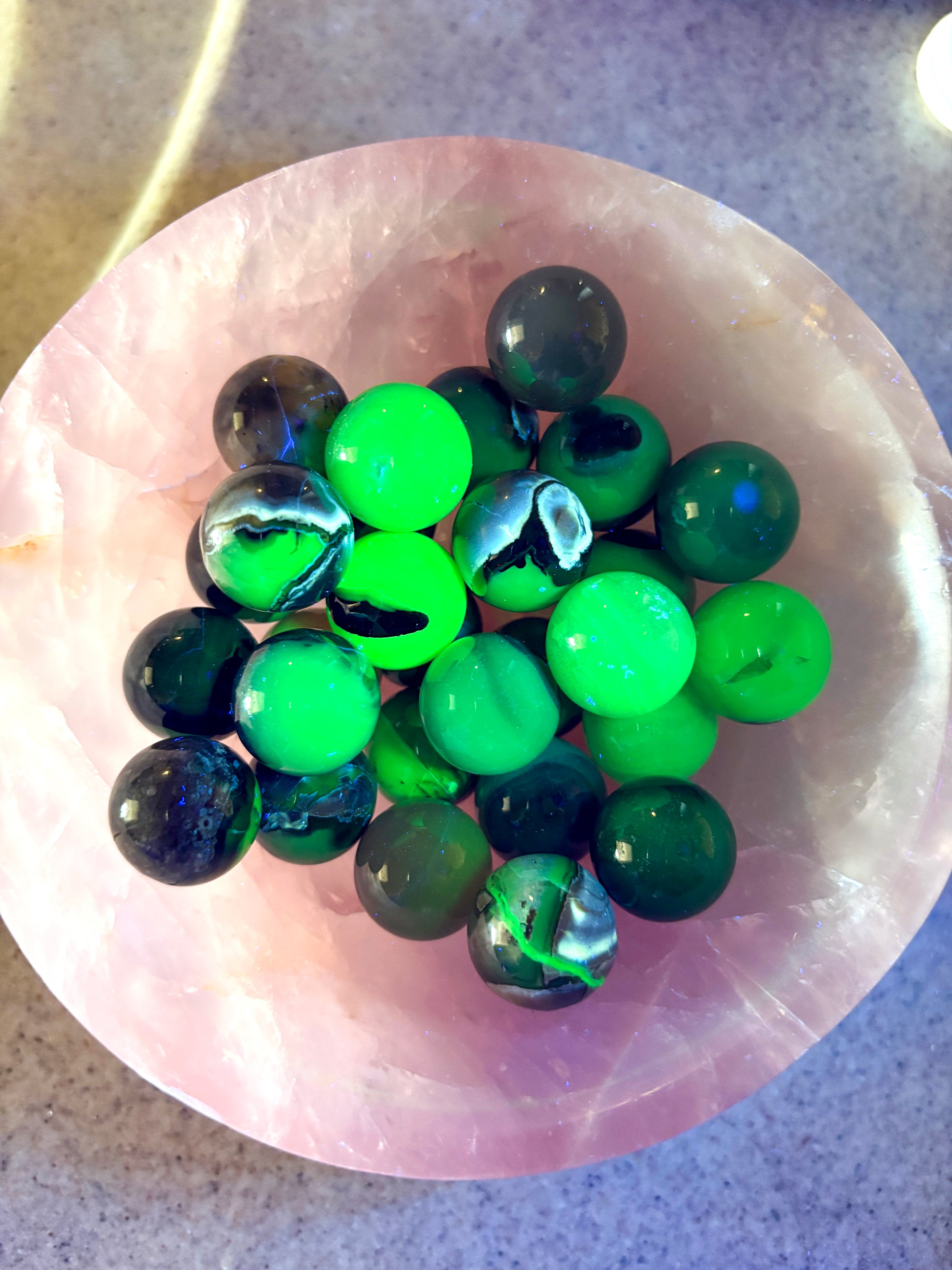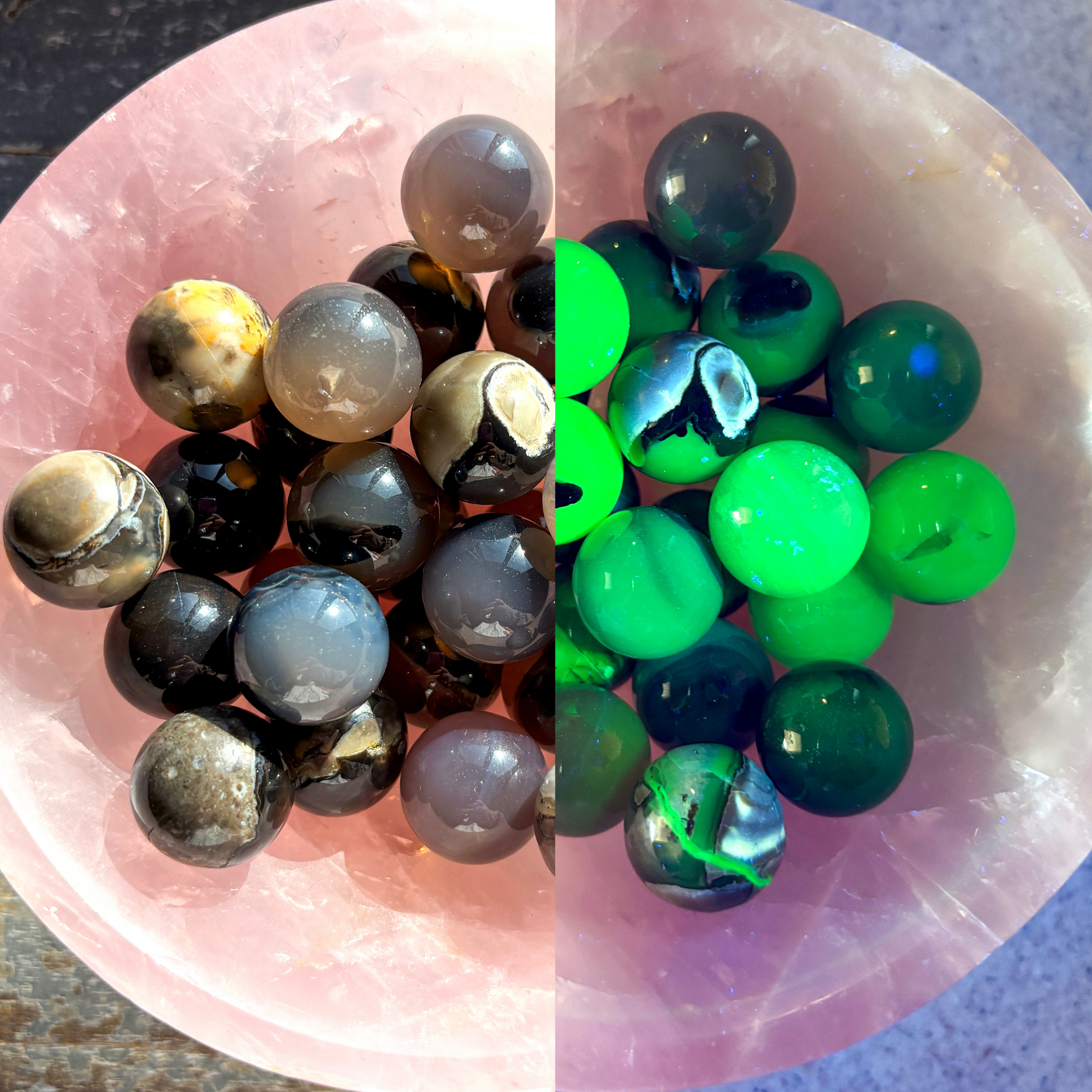 Discover the unique properties of our One (1) Volcano Agate Mini Sphere. When exposed to UV light, this beautiful sphere will react in stunning shades of green. Perfect for collectors or as a decorative piece, this mini sphere adds a touch of natural beauty to any space.