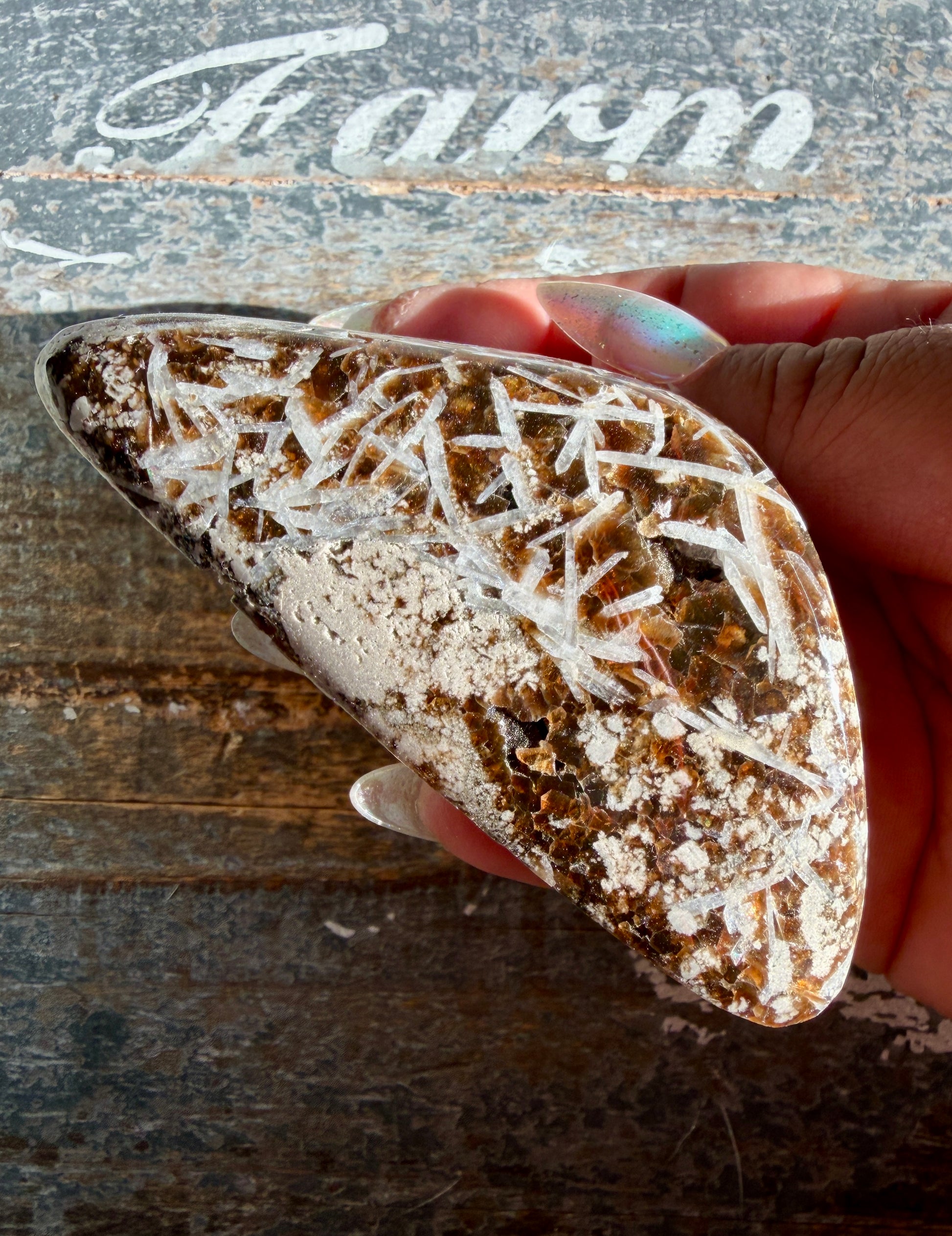 A rare and striking mineral, this Golden Phlogopite Mica freeform features warm amber mica layers with natural white crystal inclusions that add beautiful contrast and texture. Polished to highlight its golden glow, each piece is completely one-of-a-kind with unique patterns formed over millions of years.