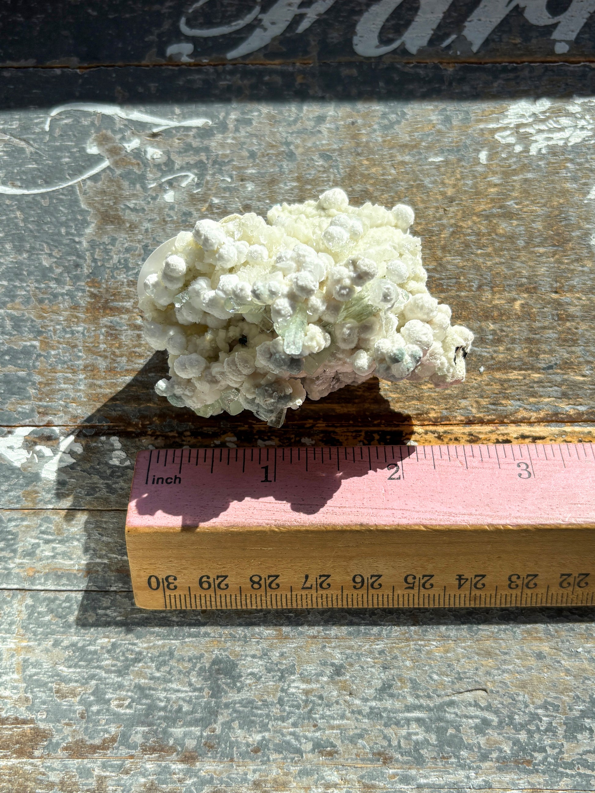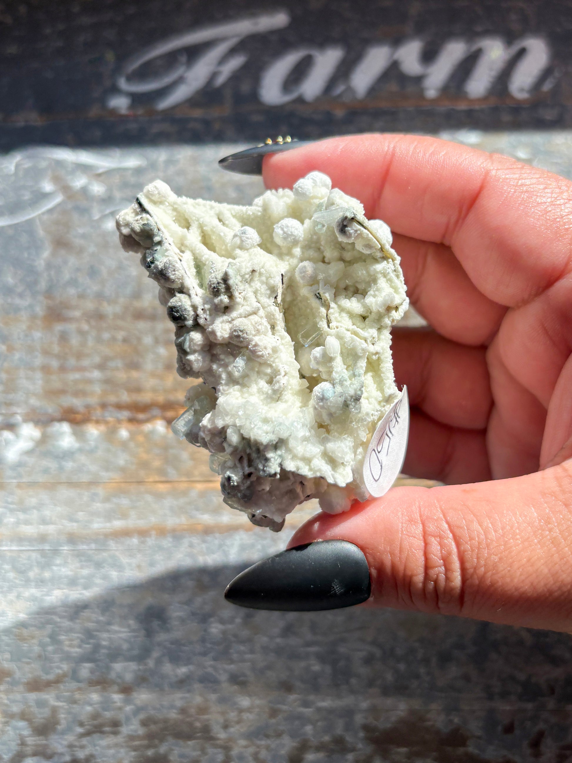 This rare and striking mineral combination features white botryoidal gyrolite beautifully accented by gemmy green apophyllite, sourced directly from India and handpicked at the Tucson Gem Show. The gemmy quality of the apophyllite is exceptionally rare, making this a standout addition to any collection.