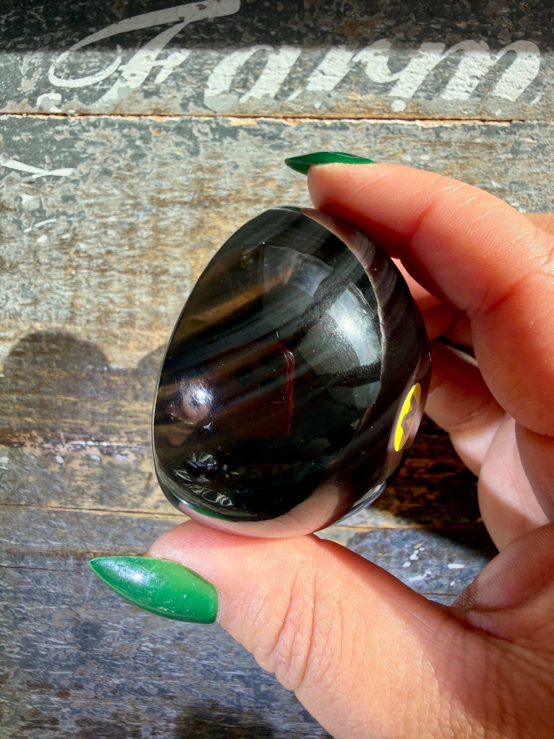 Midnight Lace Obsidian is a rare and captivating variety of obsidian, featuring natural bands of smoky translucence that seem to ripple through its deep black surface. Sourced from the volcanic landscapes of Armenia, this stone carries the protective and grounding qualities of traditional obsidian while offering a softer, more balanced energy thanks to its layered, lace-like appearance.