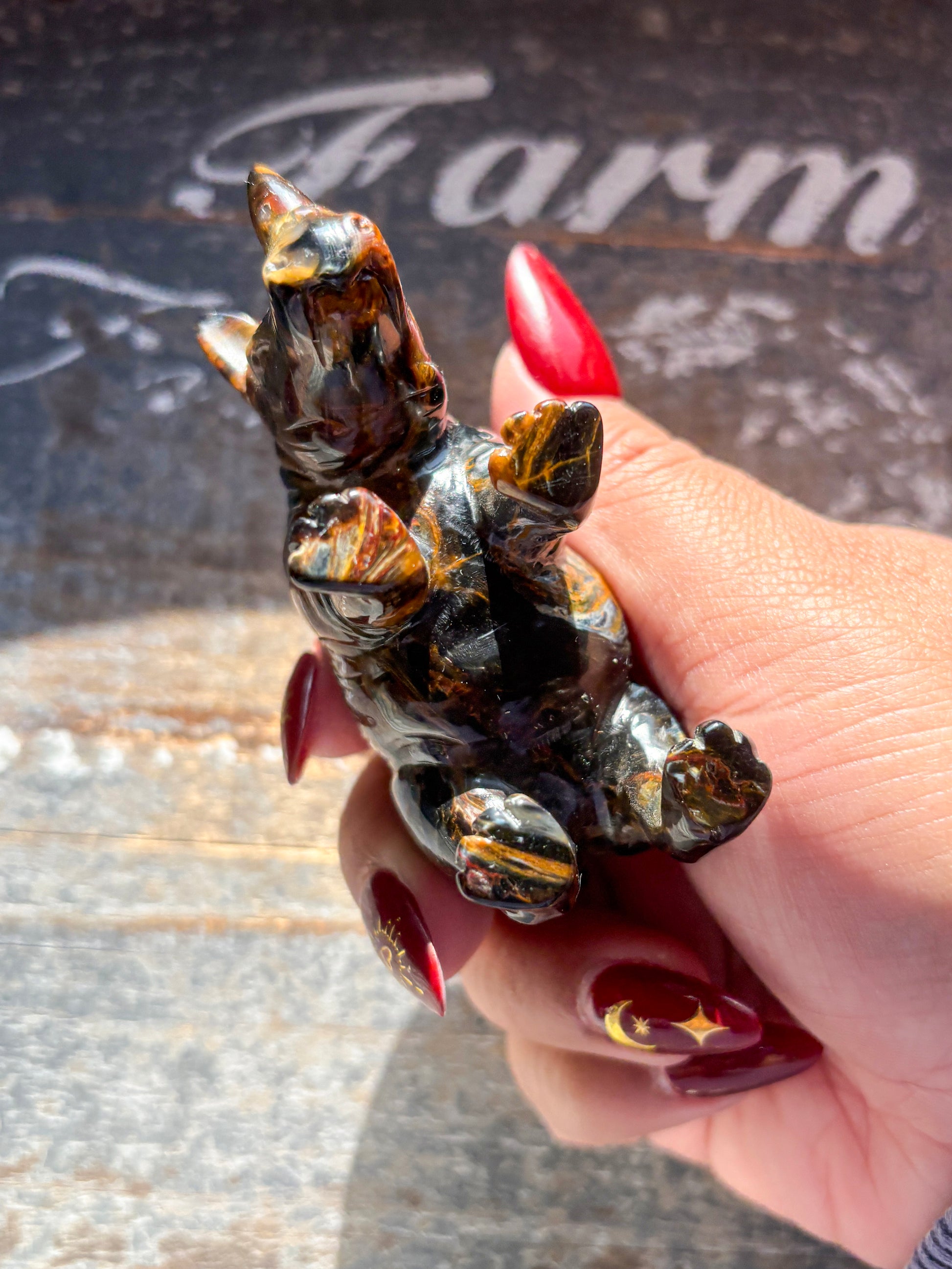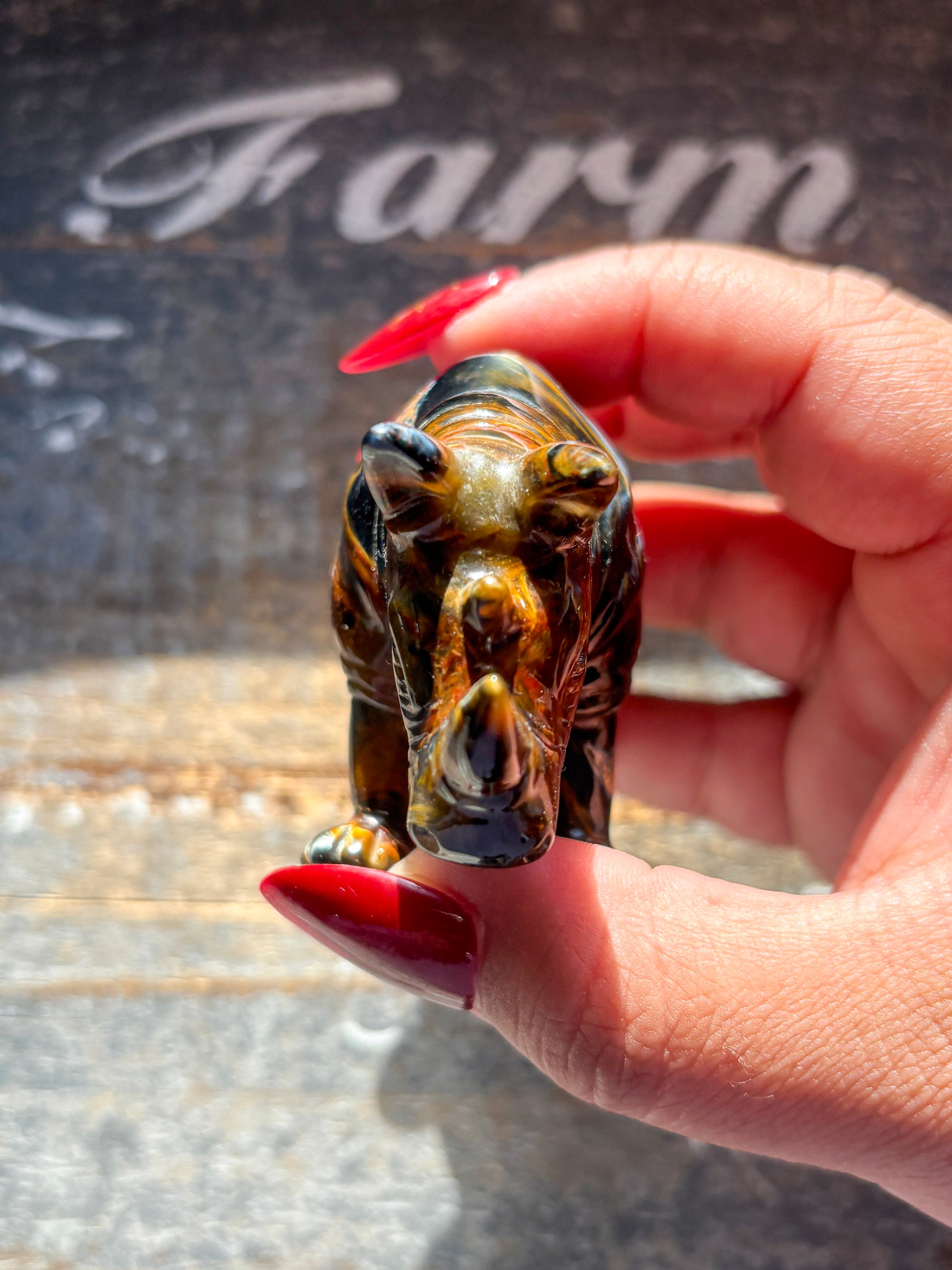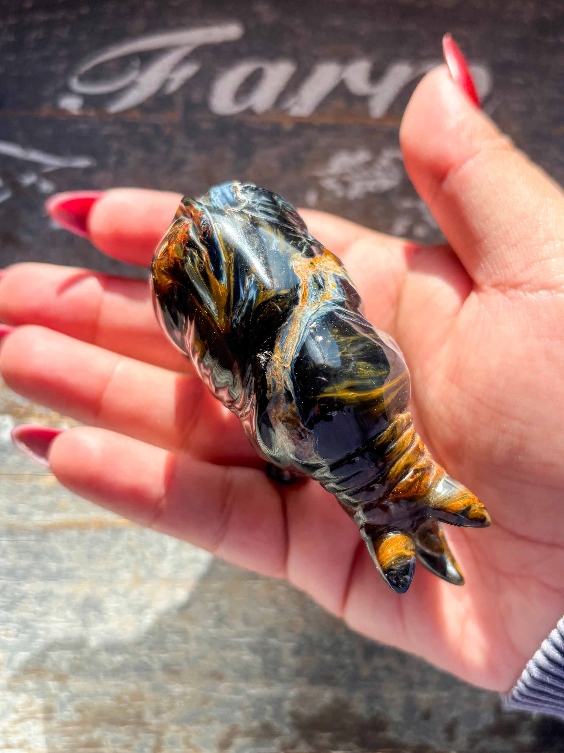 This Unique Pietersite Hand Carved Rhino is a one-of-a-kind piece, meticulously crafted by expert hands. The beautiful Pietersite stone displays rich, swirling colors, making each rhino truly unique. With its bold presence and exquisite detail, this hand carved rhino is a must-have for any collector or admirer of fine craftsmanship.